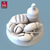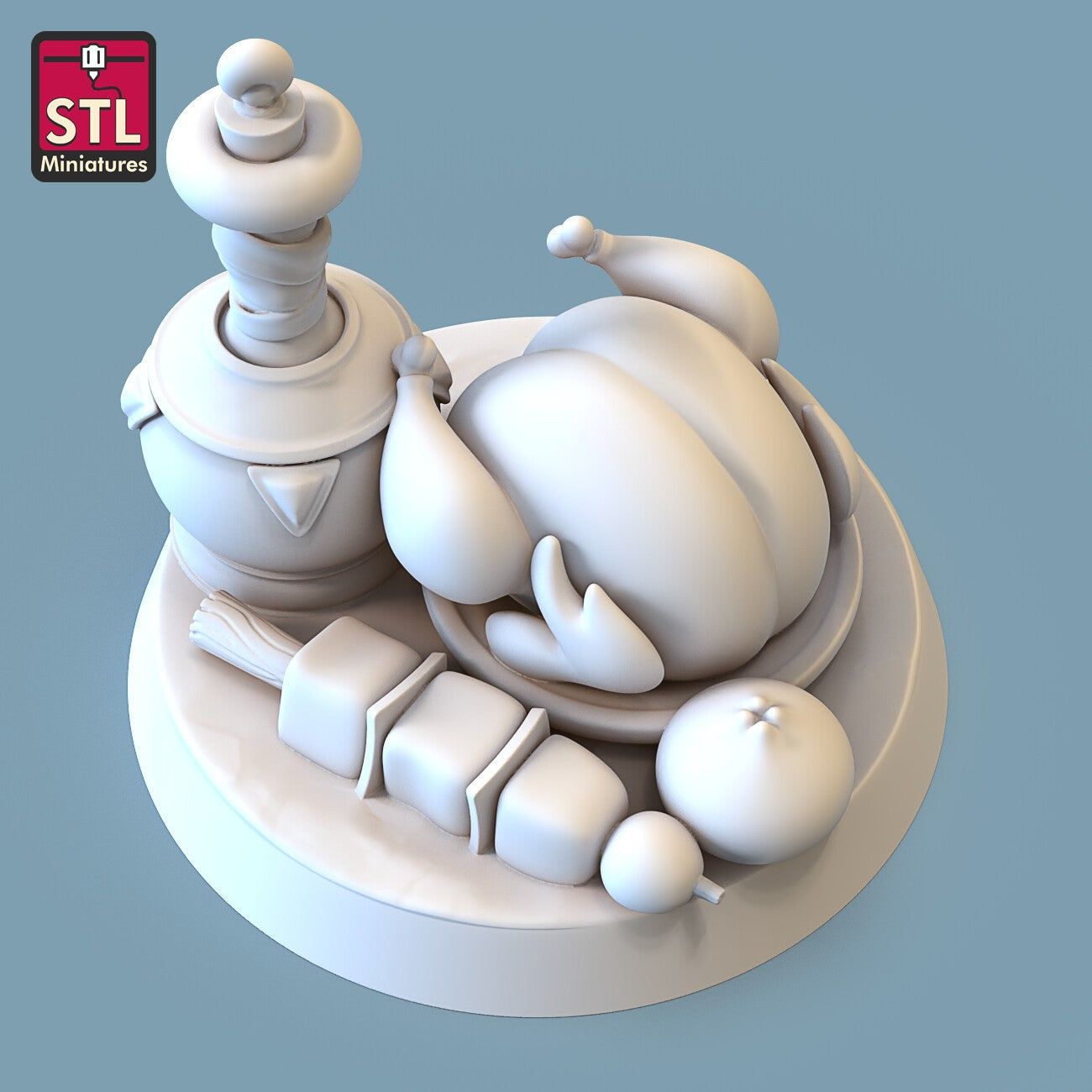 Base mit 25mm Durchmesser, auf der sich eine Karaffe, ein Bratspieß, eine Zwiebel und Geflügel auf einem Teller befinden.