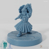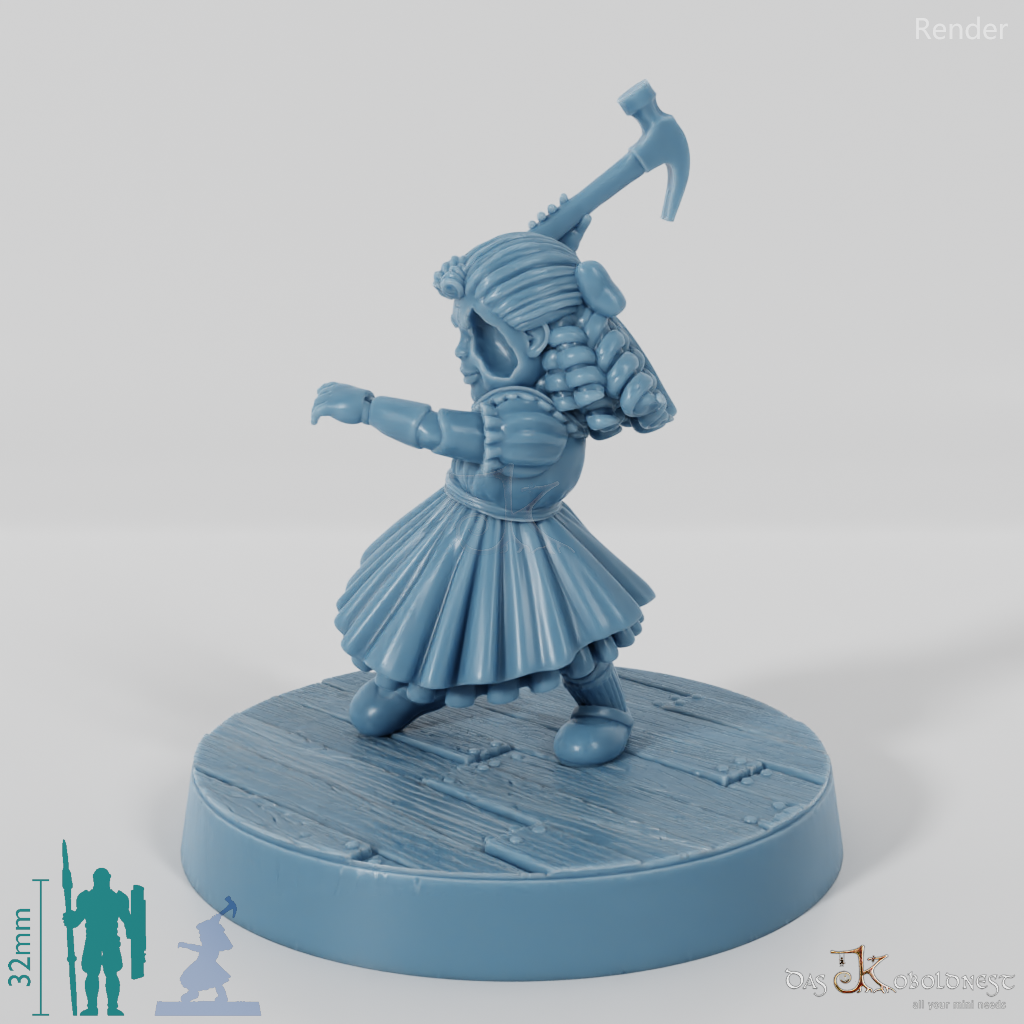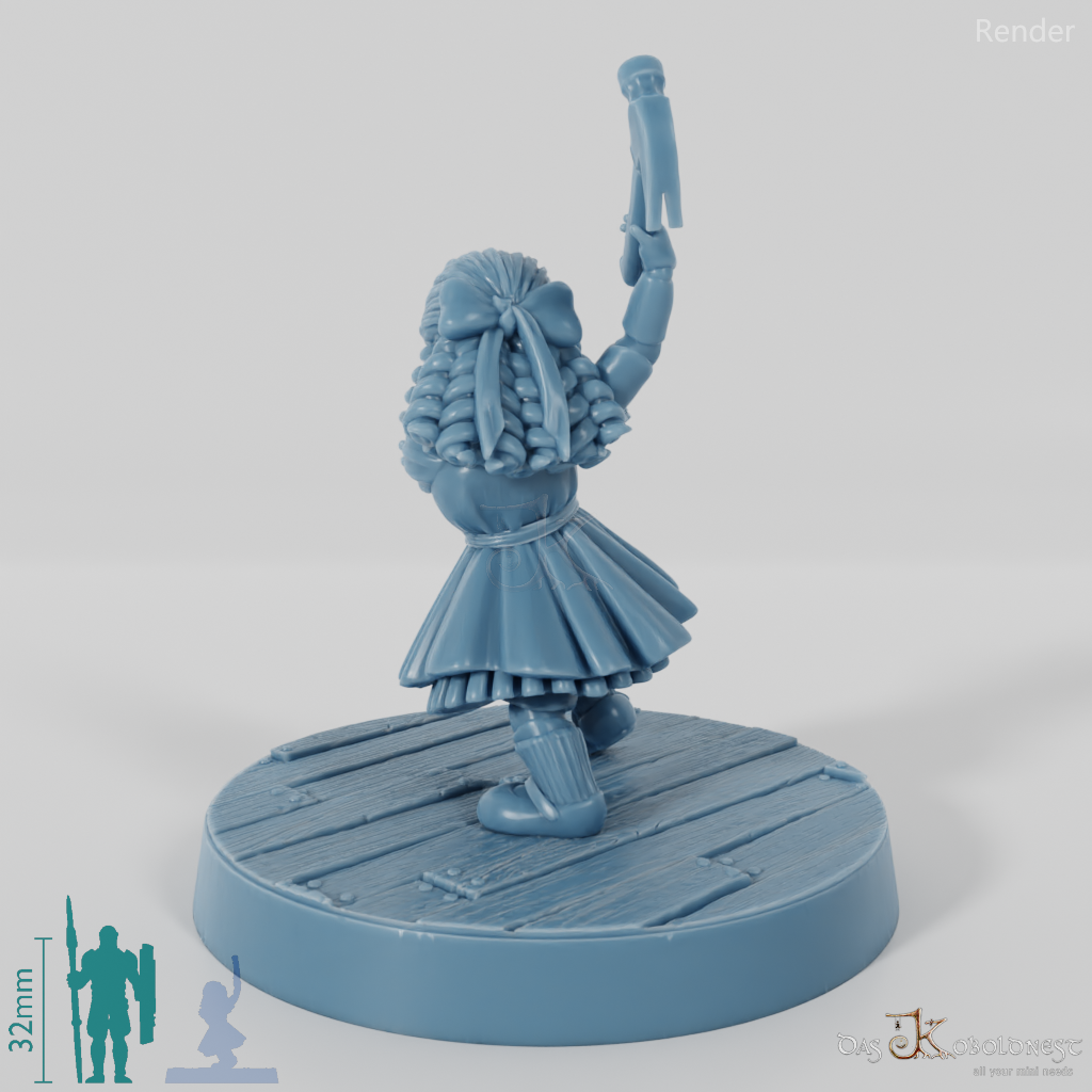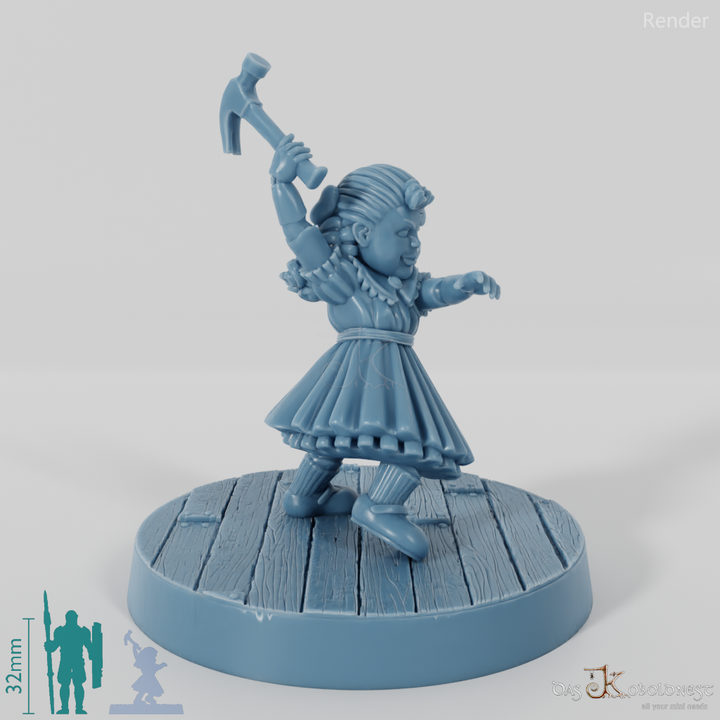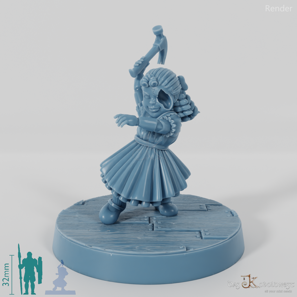 Kleine Puppe mit Locken und zerschmettertem Gesicht, die einen Latthammer in der Hand hält. Modell wahlweise mit oder ohne gestaltete 25mm-Base verfügbar.