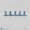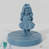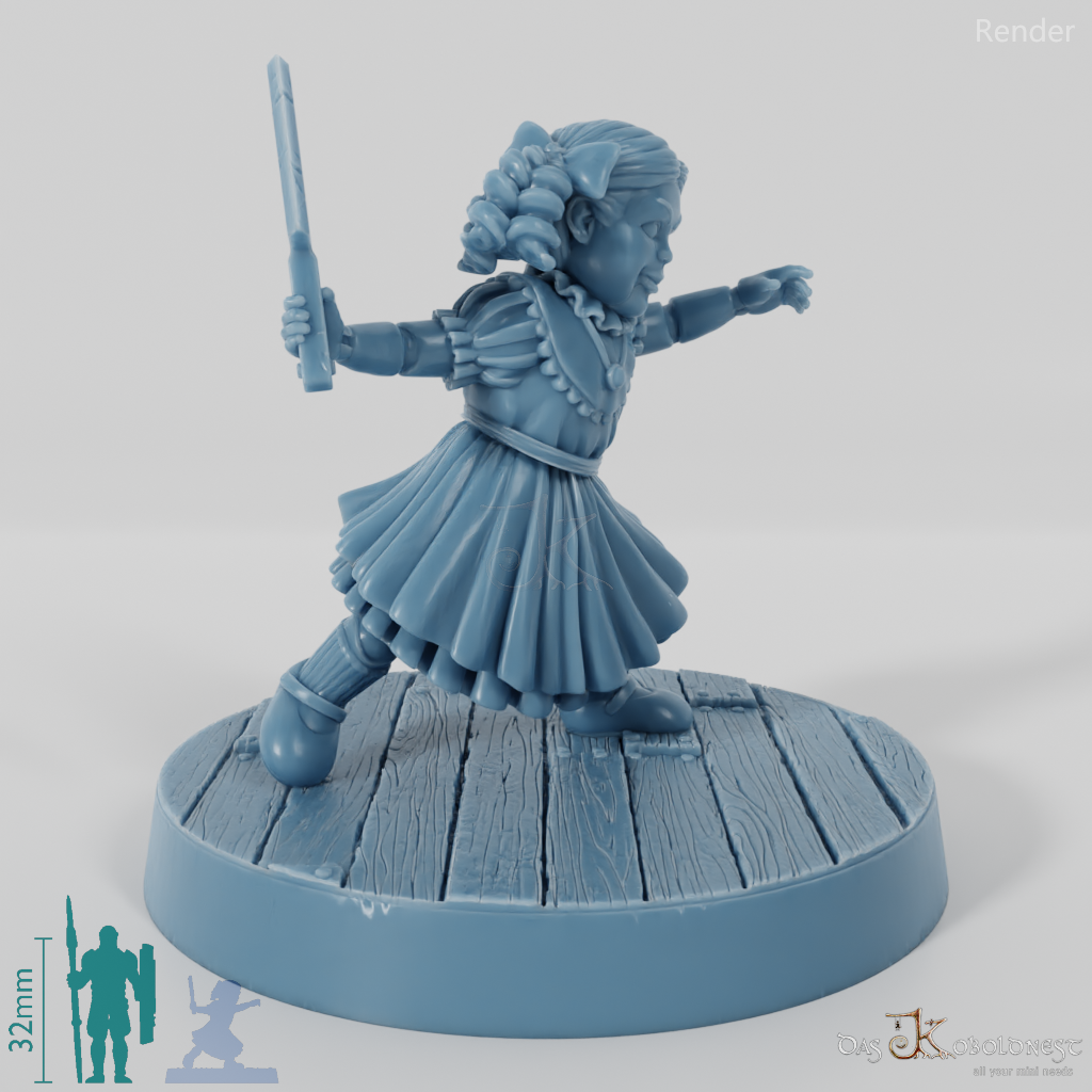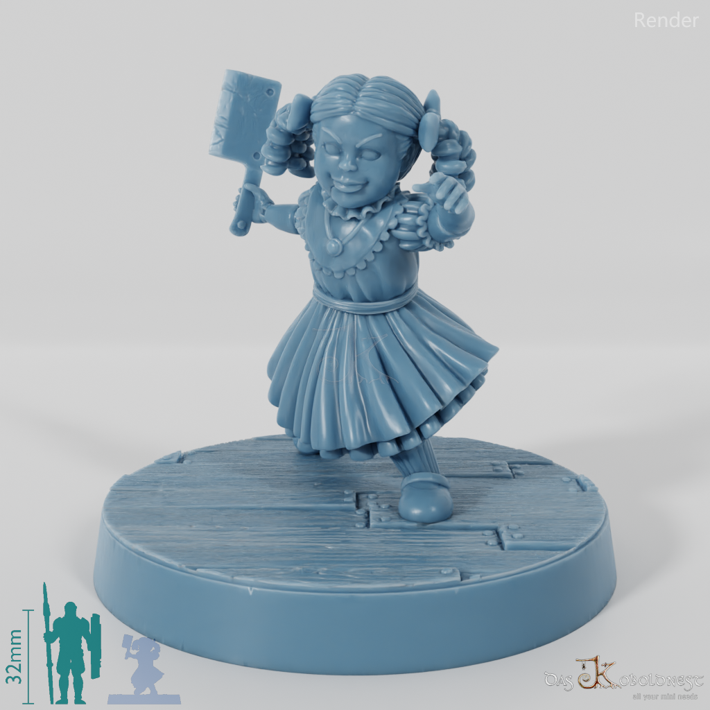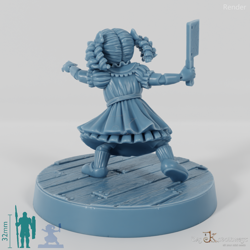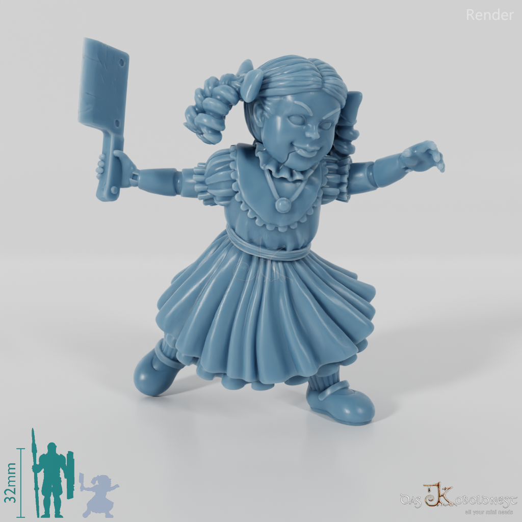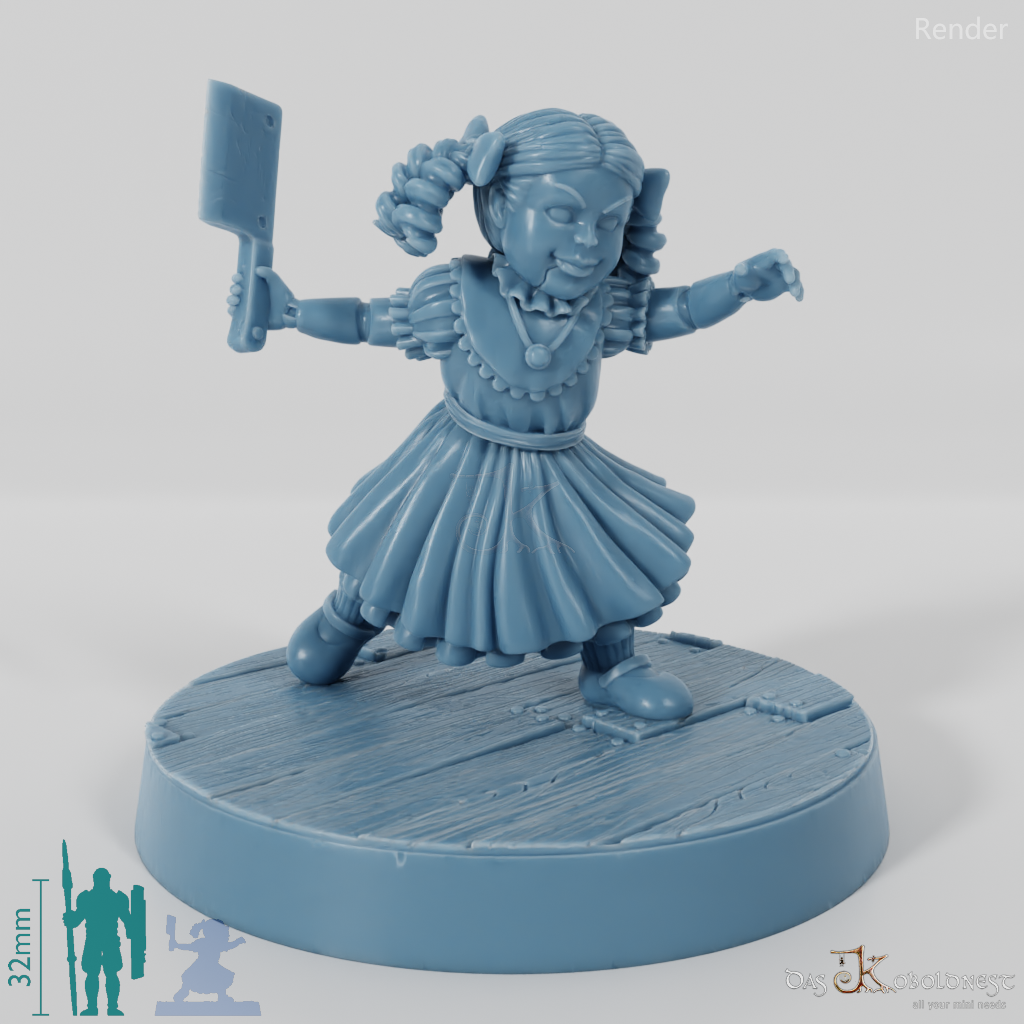 Kleine Puppe mit zu Zöpfen gebundenen Locken, die ein schartiges Schlachtbeil in der Hand hält. Modell wahlweise mit oder ohne gestaltete 25mm-Base verfügbar.