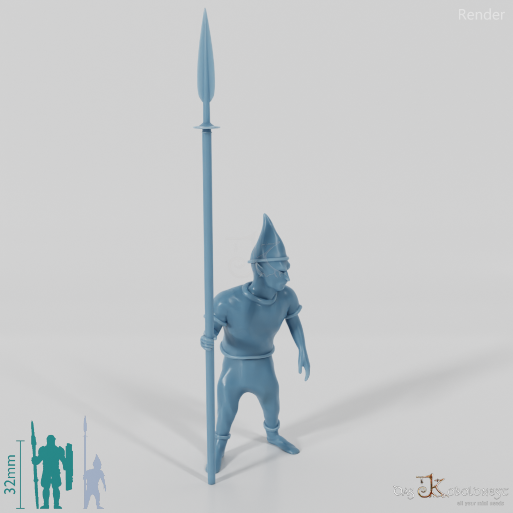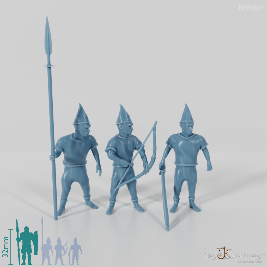 Drei Weihnachtselfen mit spitzen Mützen und grimmigen Gesichtern, von denen einer einen langen Speer, einer einen Bogen und einer ein Schwert hält Model: Evil Santa's Elves by YourNeighborKnight, released under CC BY 4.0