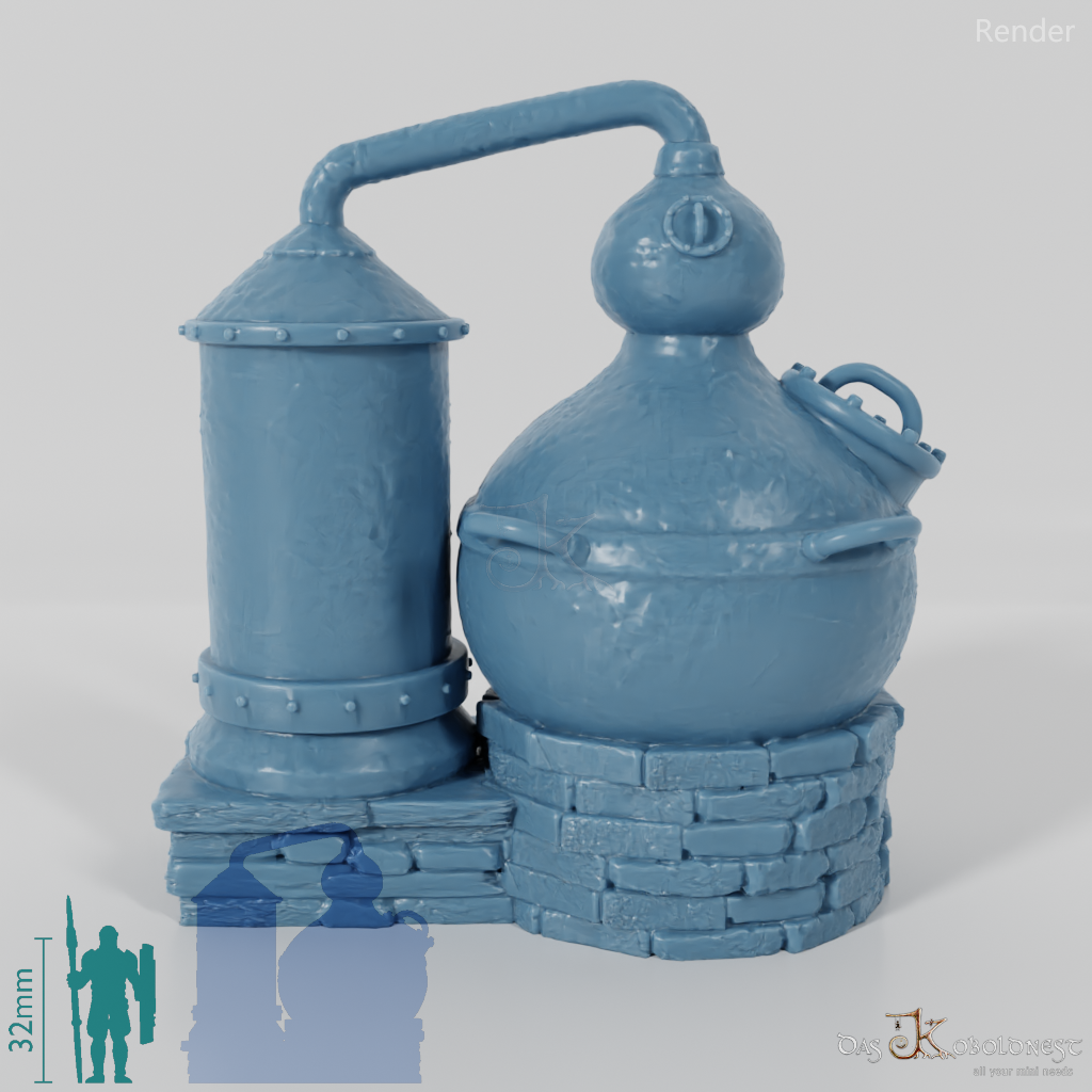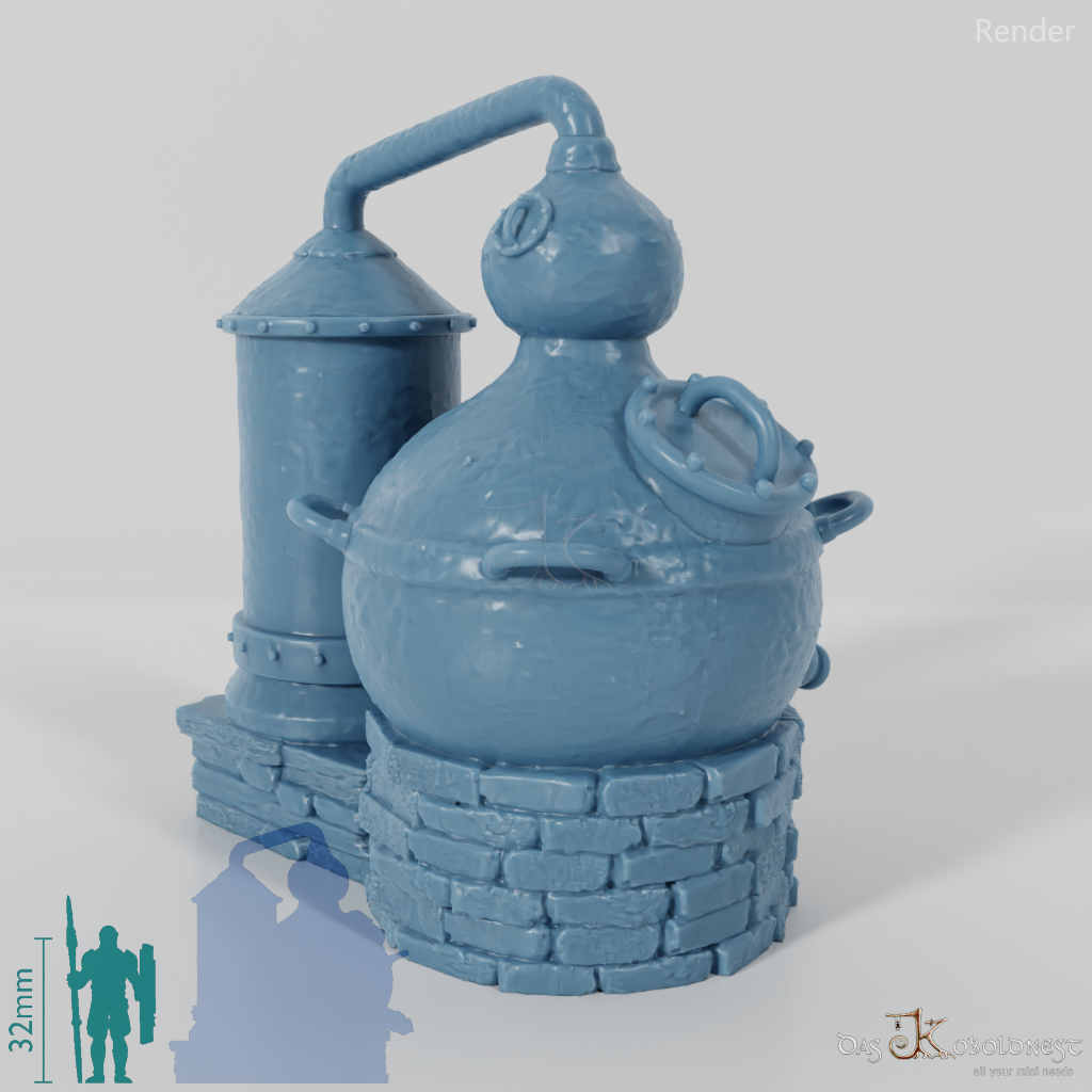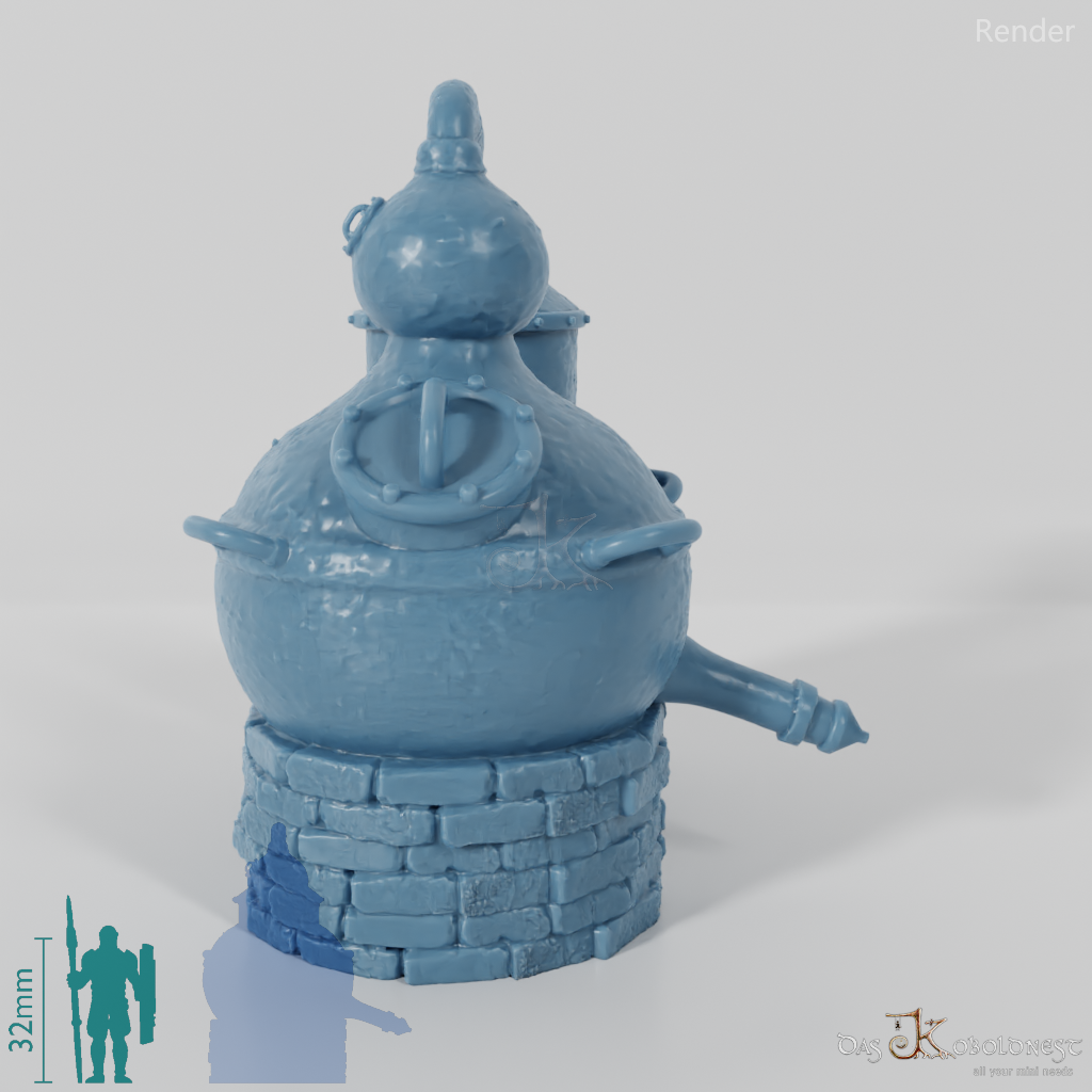 Große, metallene Branntweindestille mit zwei Kammern, die auf einem gemauerten Sockel steht
