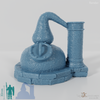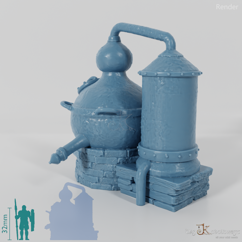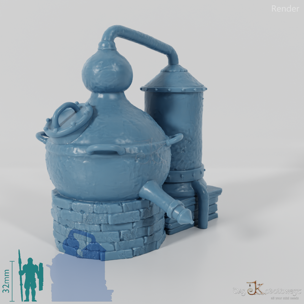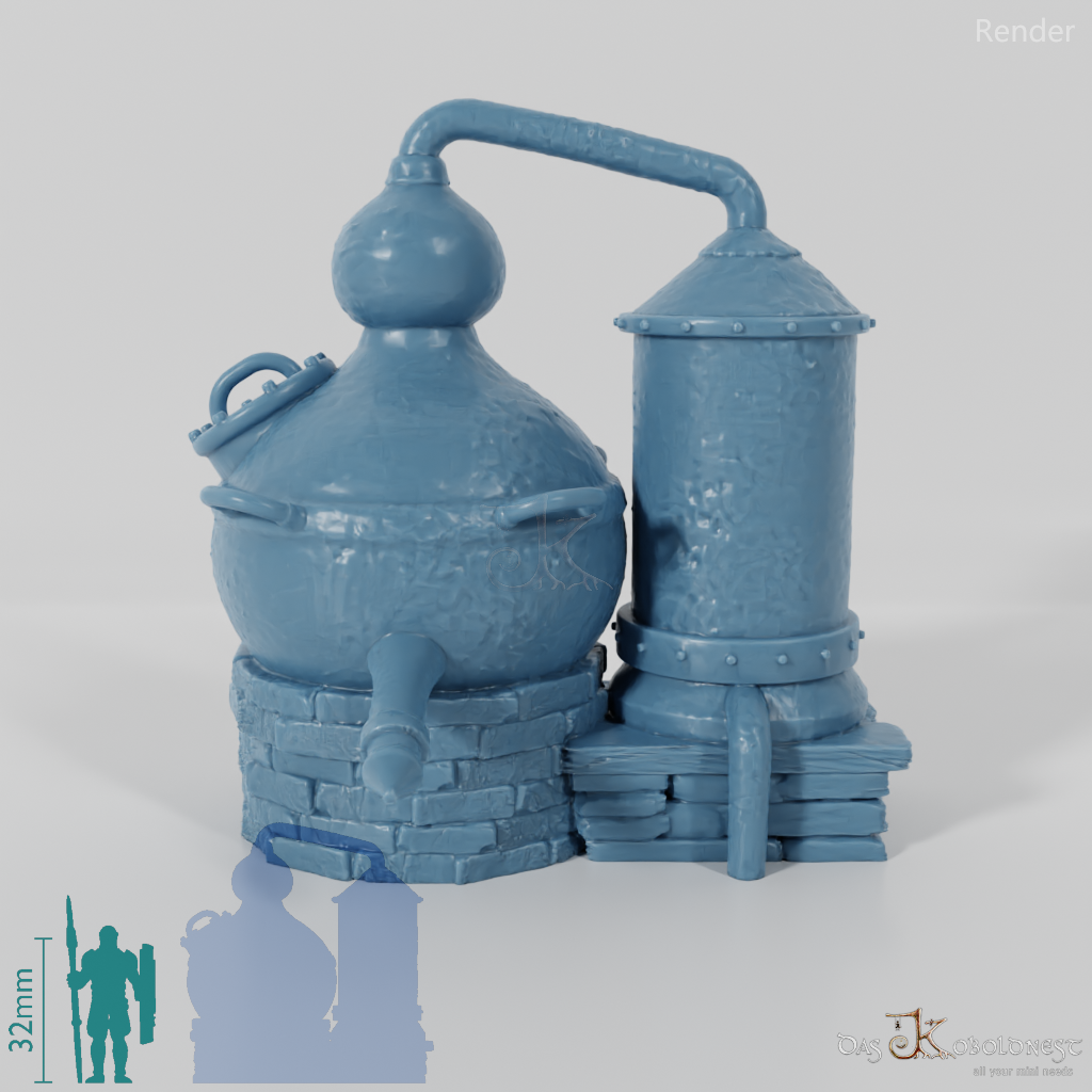 Große, metallene Branntweindestille mit zwei Kammern, die auf einem gemauerten Sockel steht