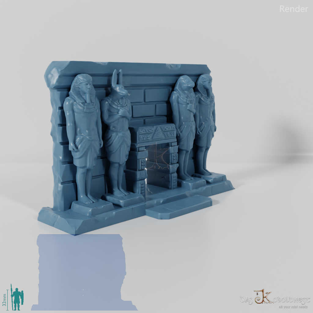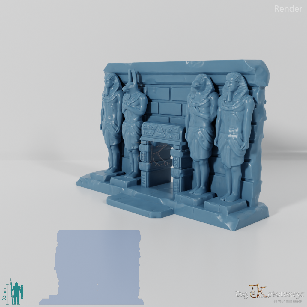 Hohe Tempelfassade mit offenem Eingang, der von vier großen Götter- und Pharaonenstatuen gesäumt ist