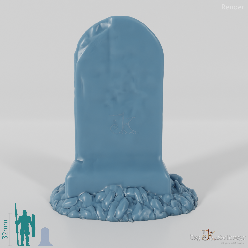 Kleiner, ordentlich gearbeiteter Grabstein mit leichter Verwitterung, der auf einem kleinen Erdhügel steht