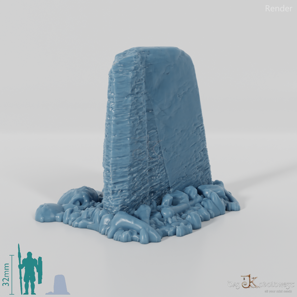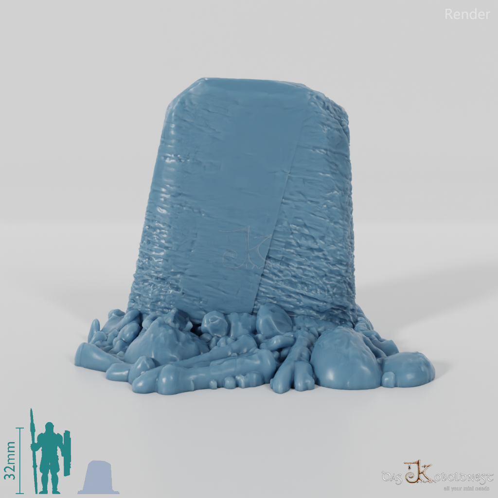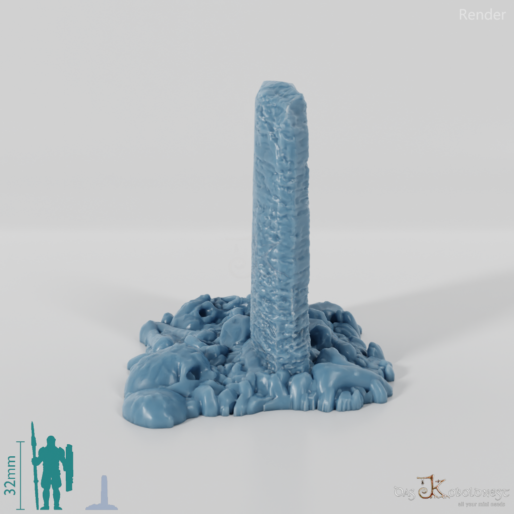 Schmaler, aufrechter Steinblock, der inmitten von Knochen und skelettierten Überresten steht