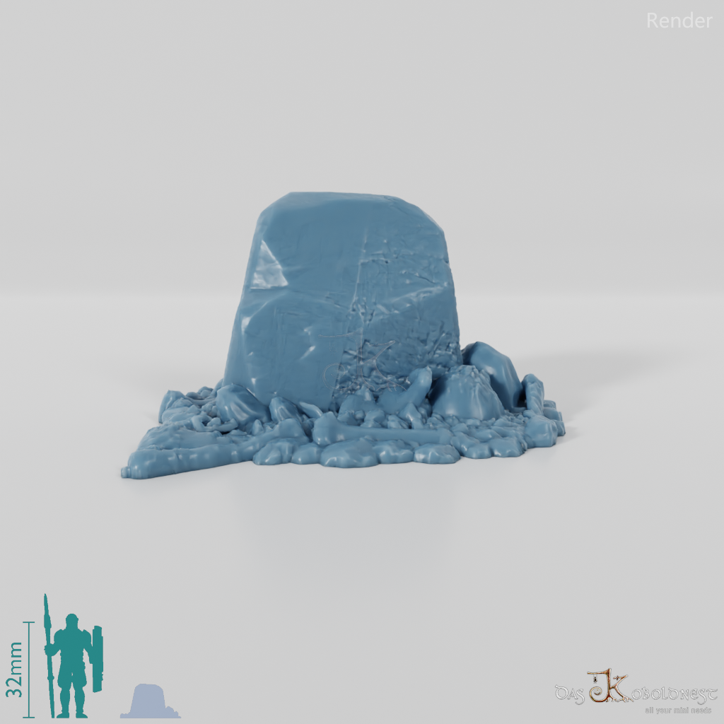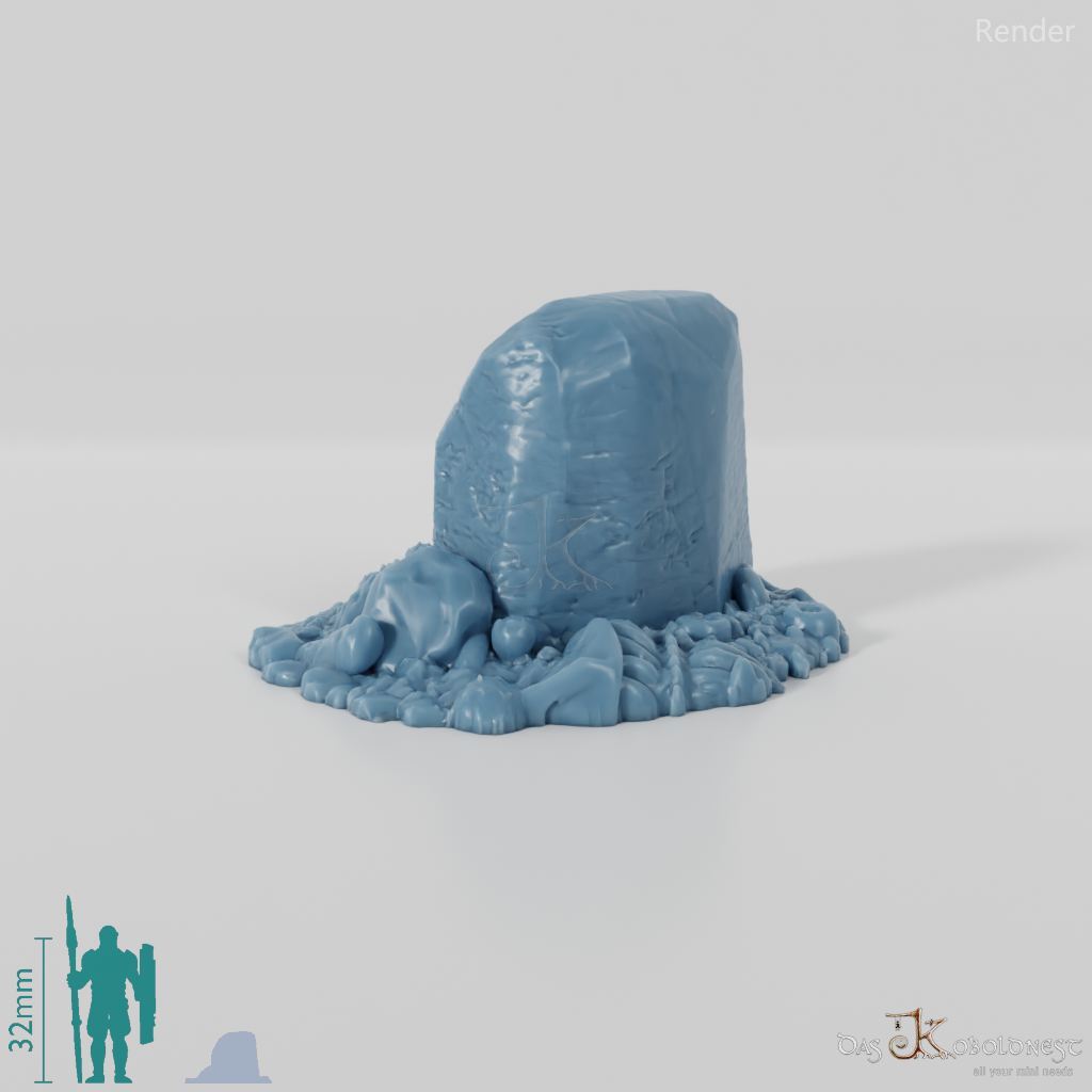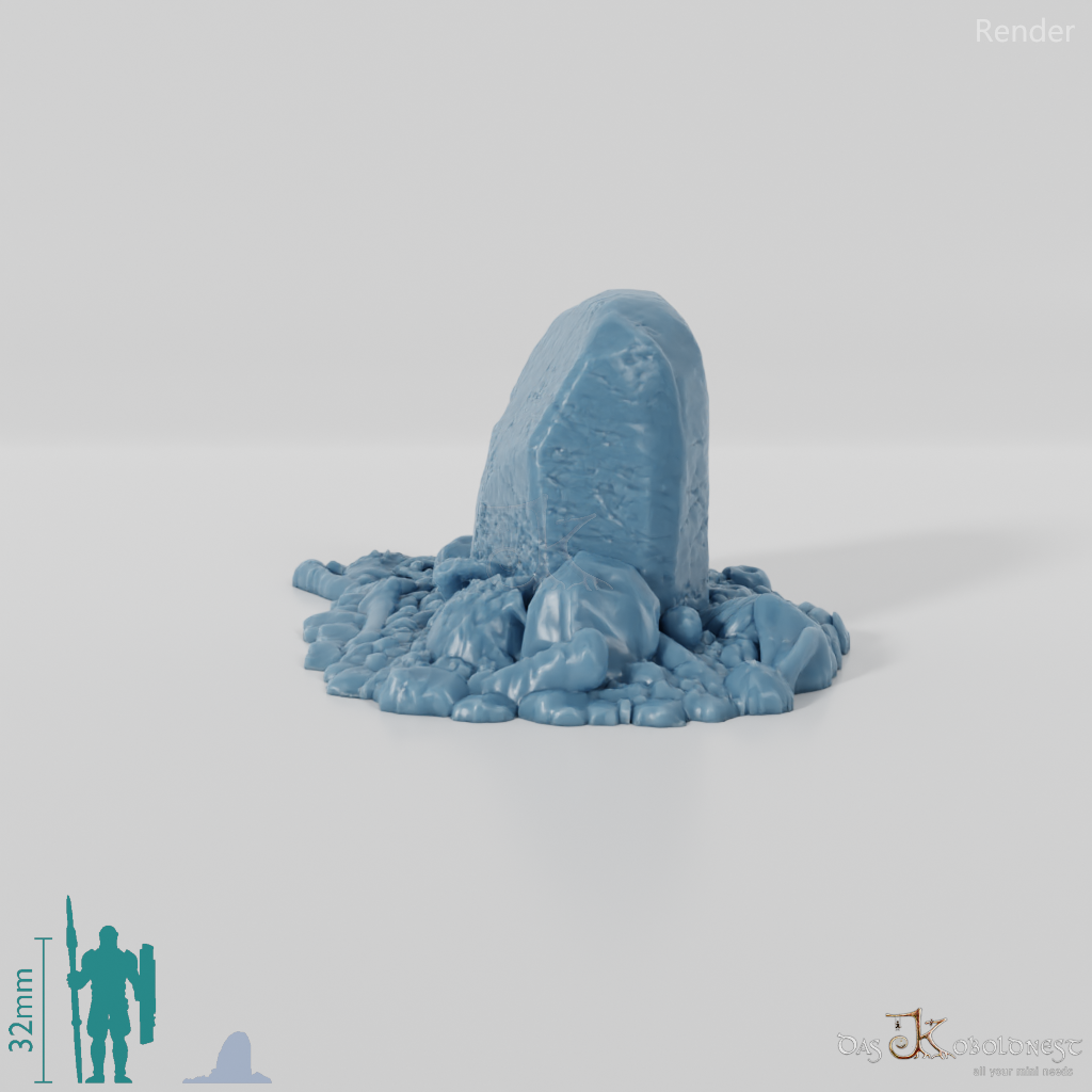 Schmaler, aufrechter Steinblock, der inmitten von Knochen und skelettierten Überresten steht