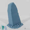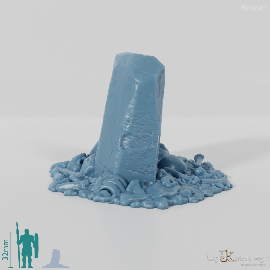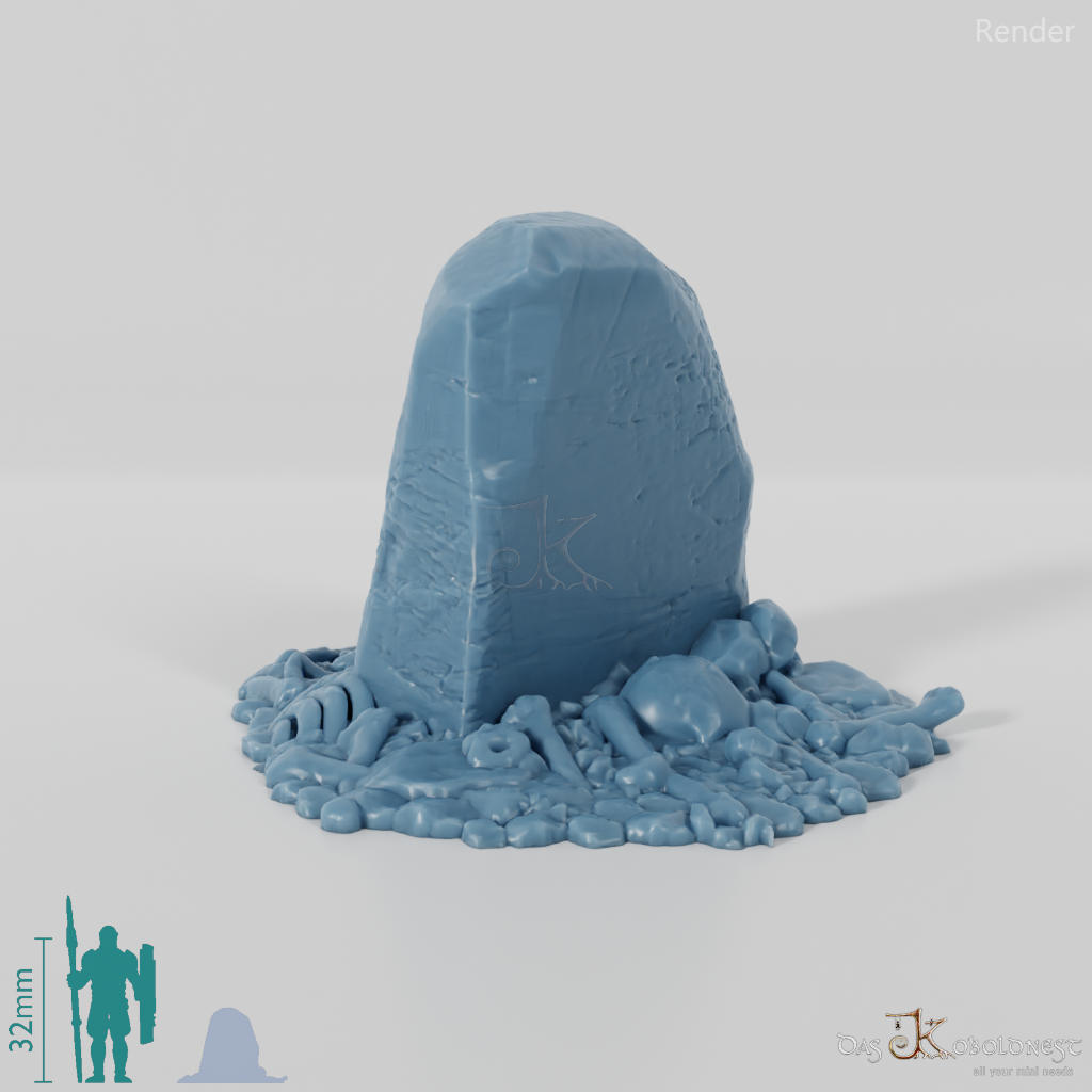 Schmaler, aufrechter Steinblock, der inmitten von Knochen und skelettierten Überresten steht