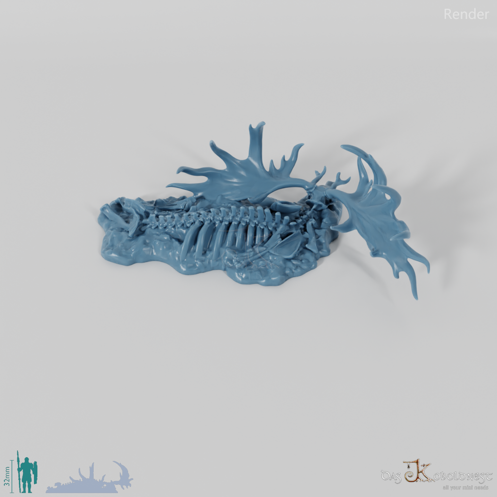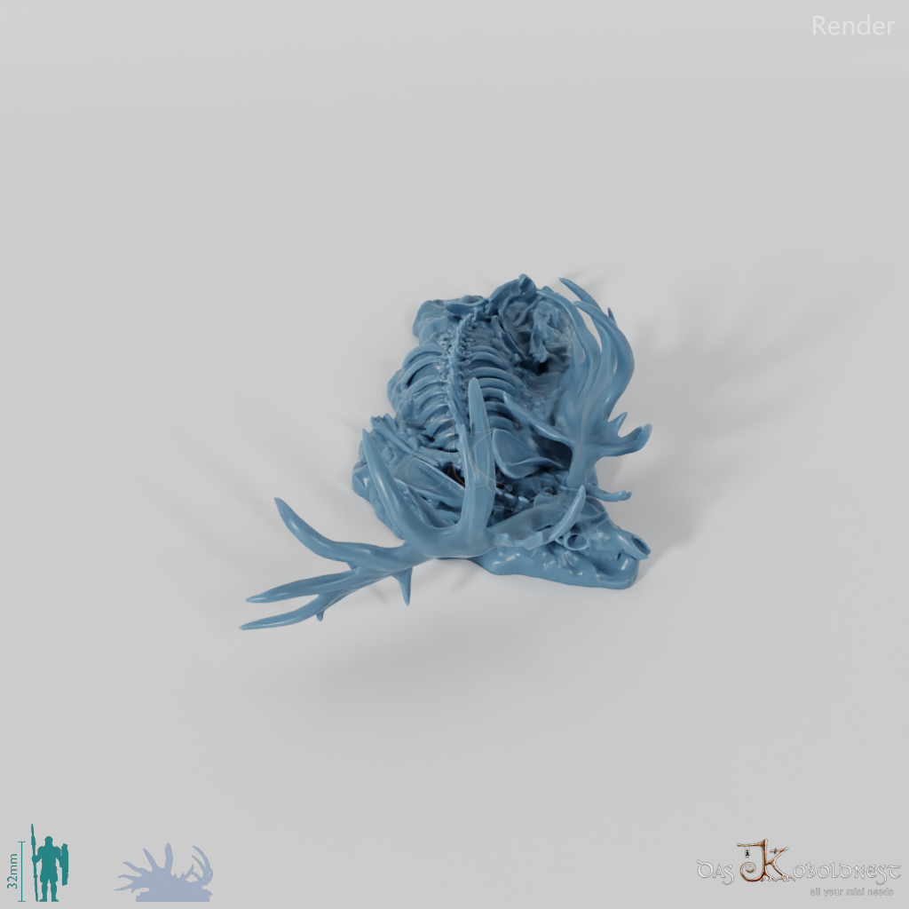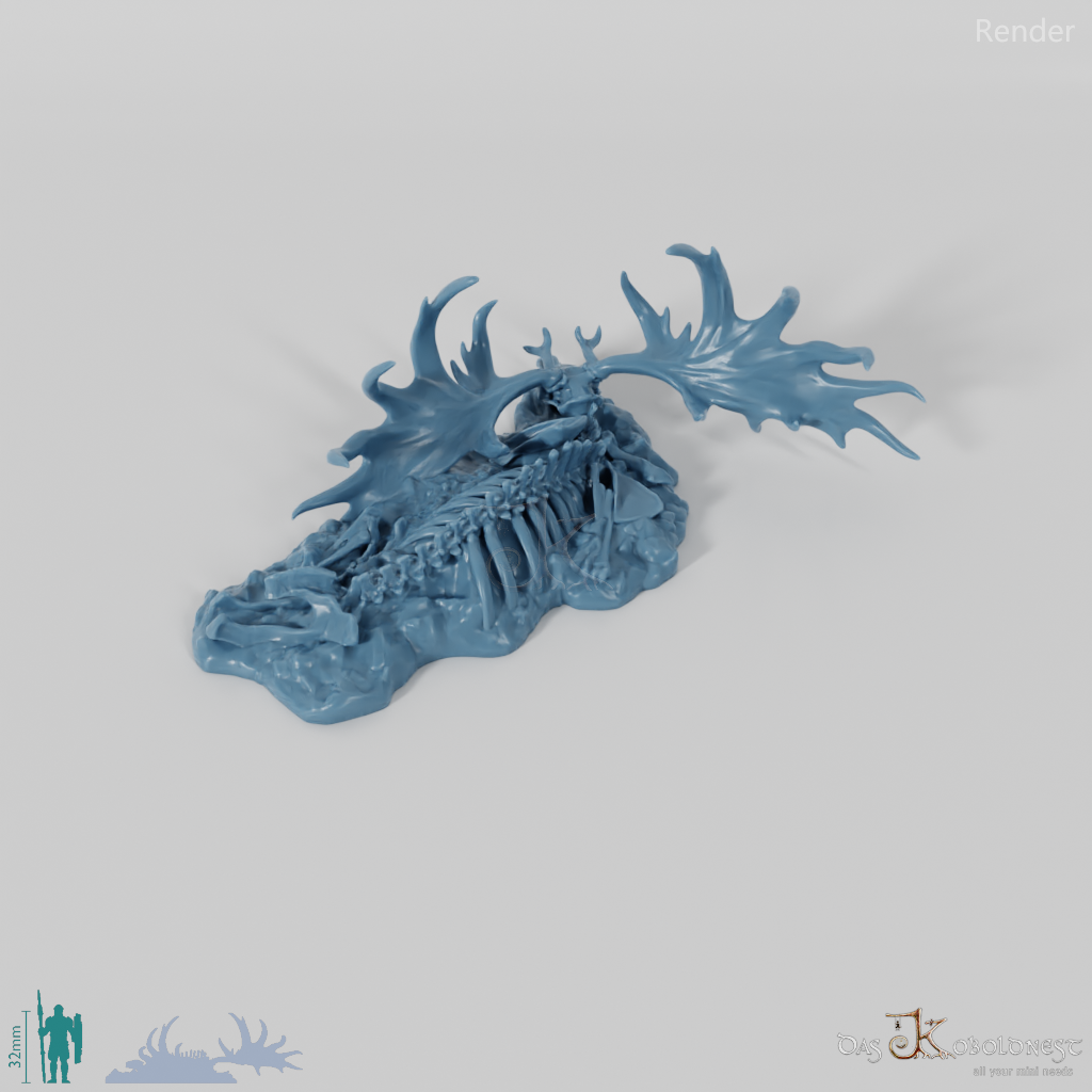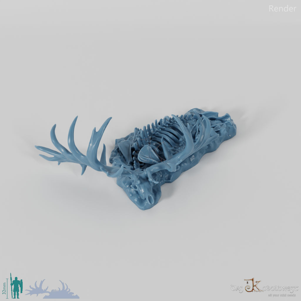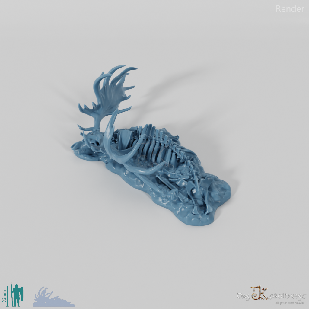 Skelettierter Riesenhirsch, dessen Knochen auf einem Erdhaufen liegen