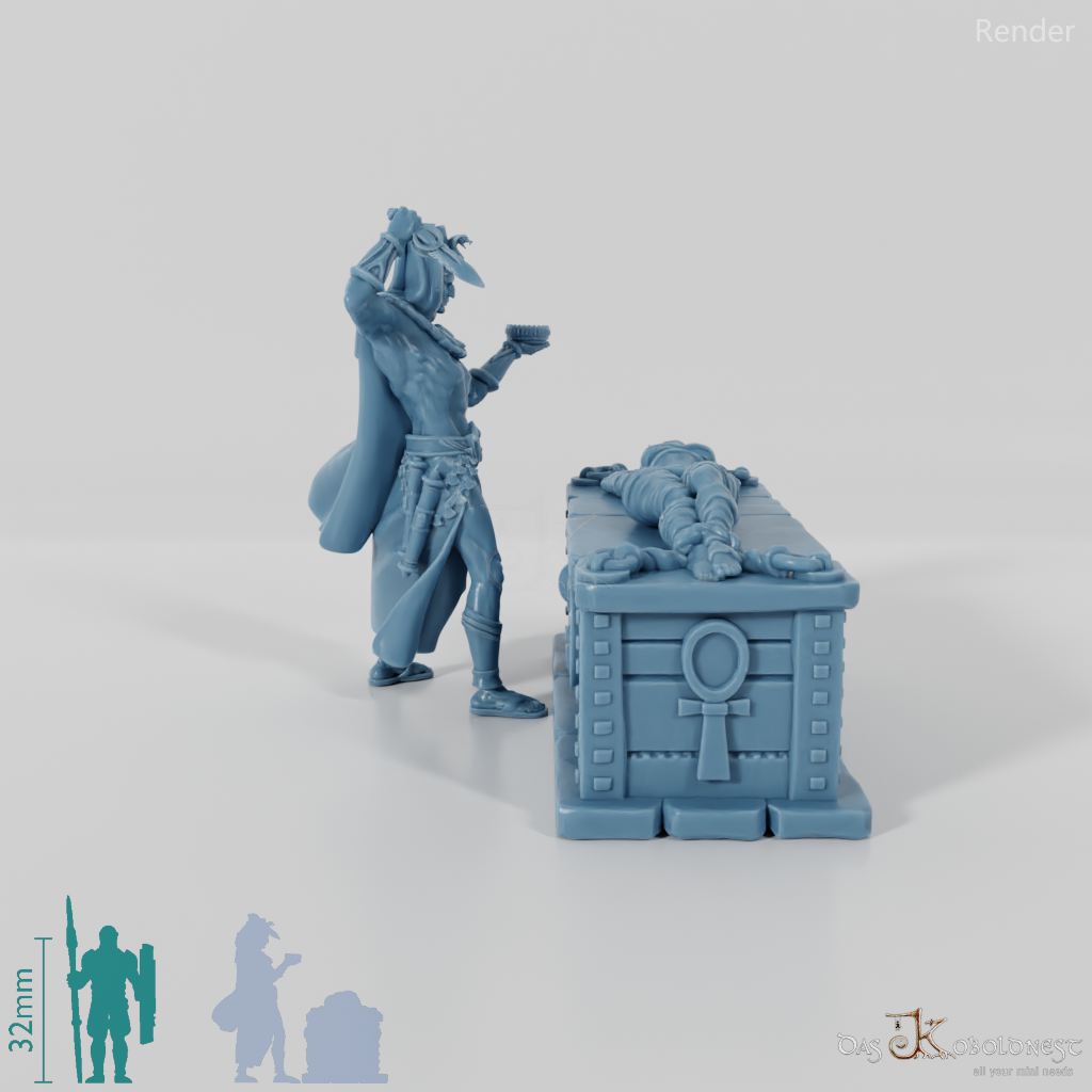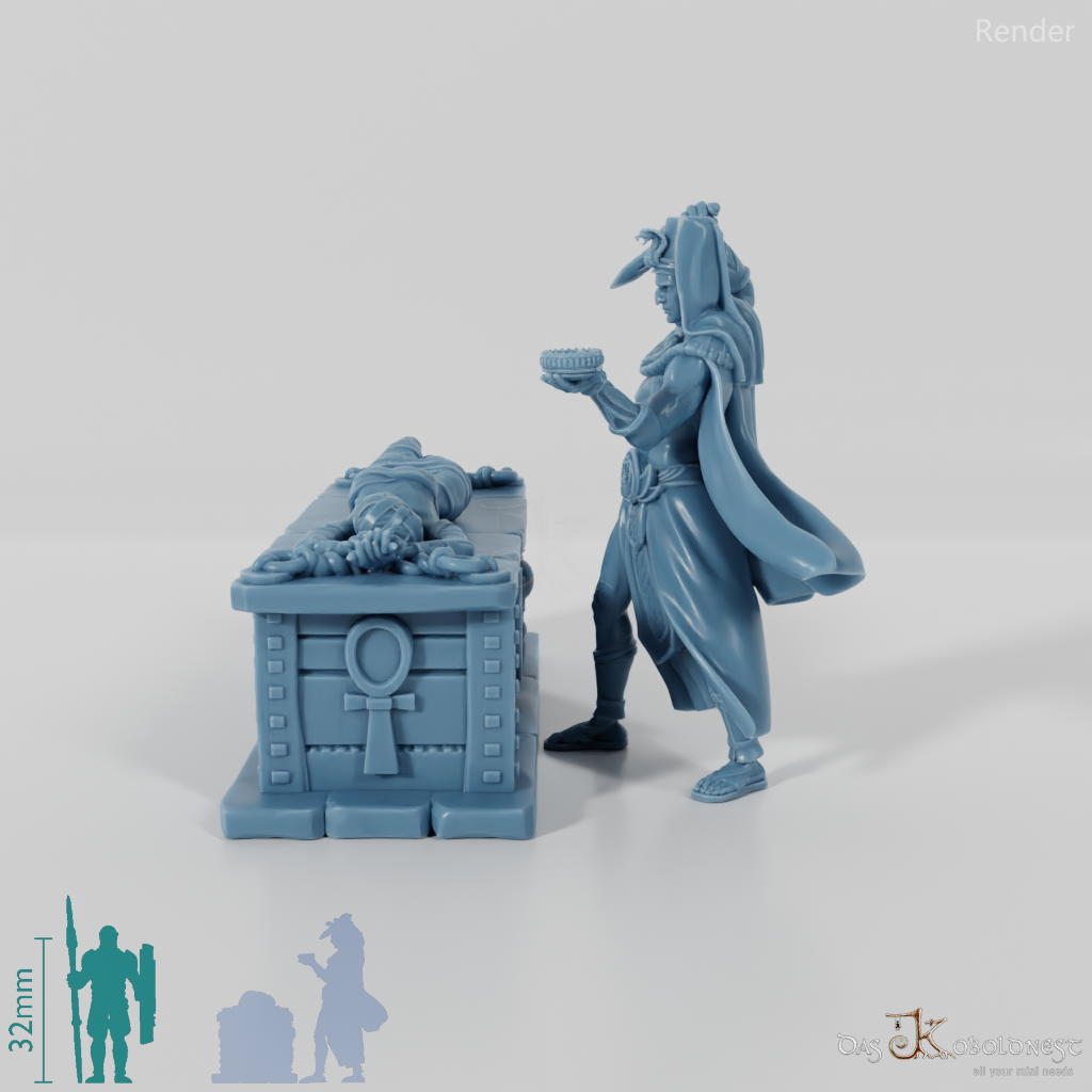 Hohepriester mit erhobenem Dolch, der vor einer gefesselten Gestalt in Bandagen auf einem Altar steht. Artikel besteht aus Opferpriester, Altar und Opfer