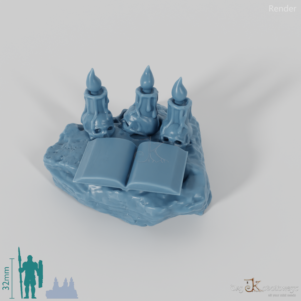 Aufgeschlagenes Buch, das auf einem flachen Felsen liegt und von drei Schädelkerzen beleuchtet wird