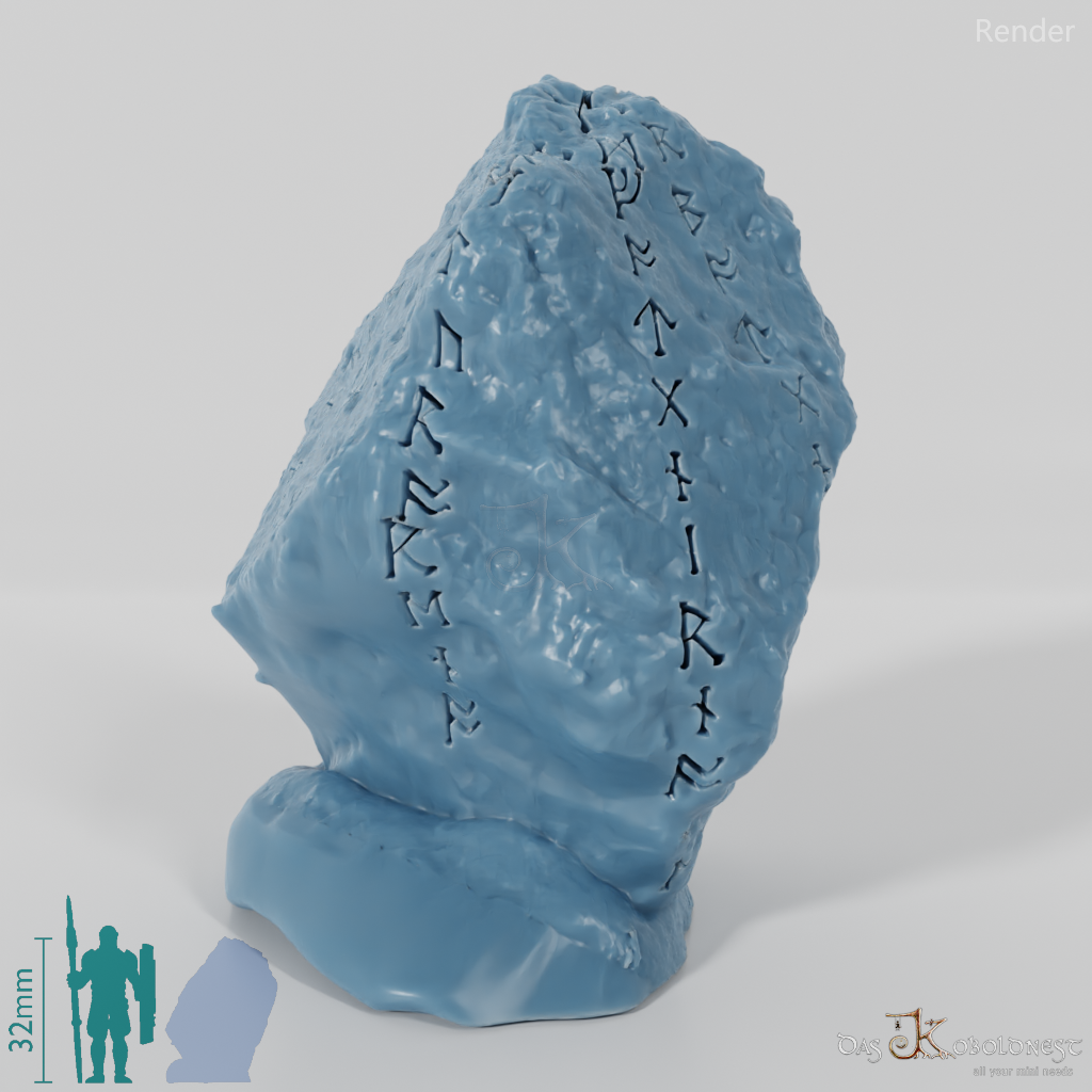 Mannshoher Felsbrocken mit eingravierten Runen.   Modell: Descent 2nd ed. Summoned stone familiar mini by agademer, lizenziert unter CC BY 3.0.
