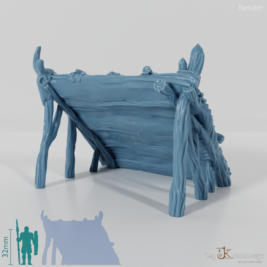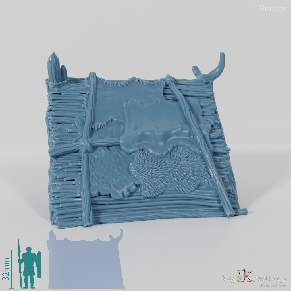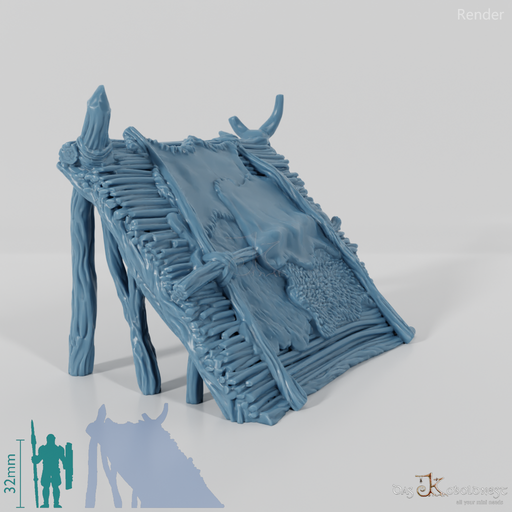 Einfaches Schrägdach aus Holz, das zum Schutz vor Regen mit Leder und Tierhäuten bedeckt ist.