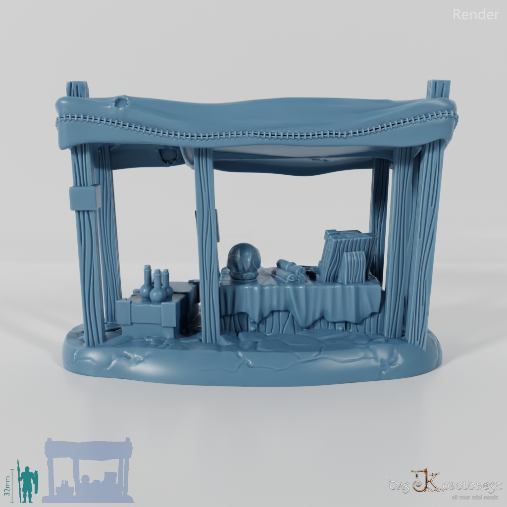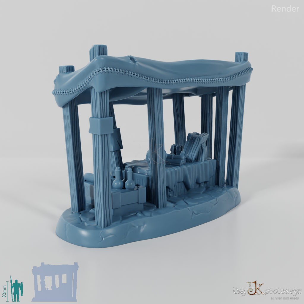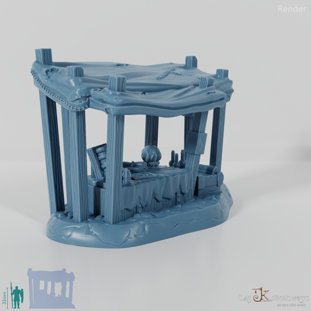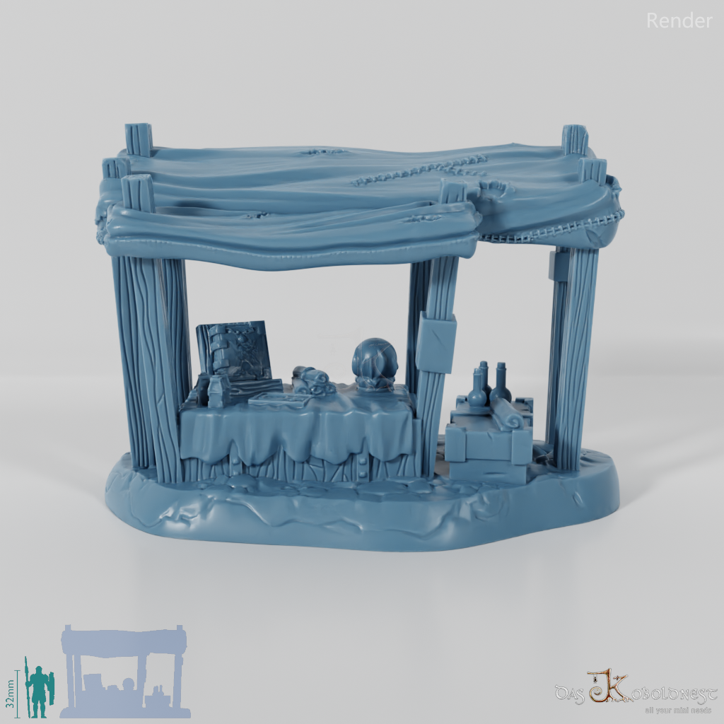 Kleiner Zeltstand mit geflickter Plane über Holzpfosten, der allerlei magische Gegenstände feilbietet.