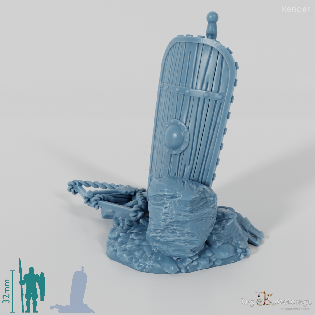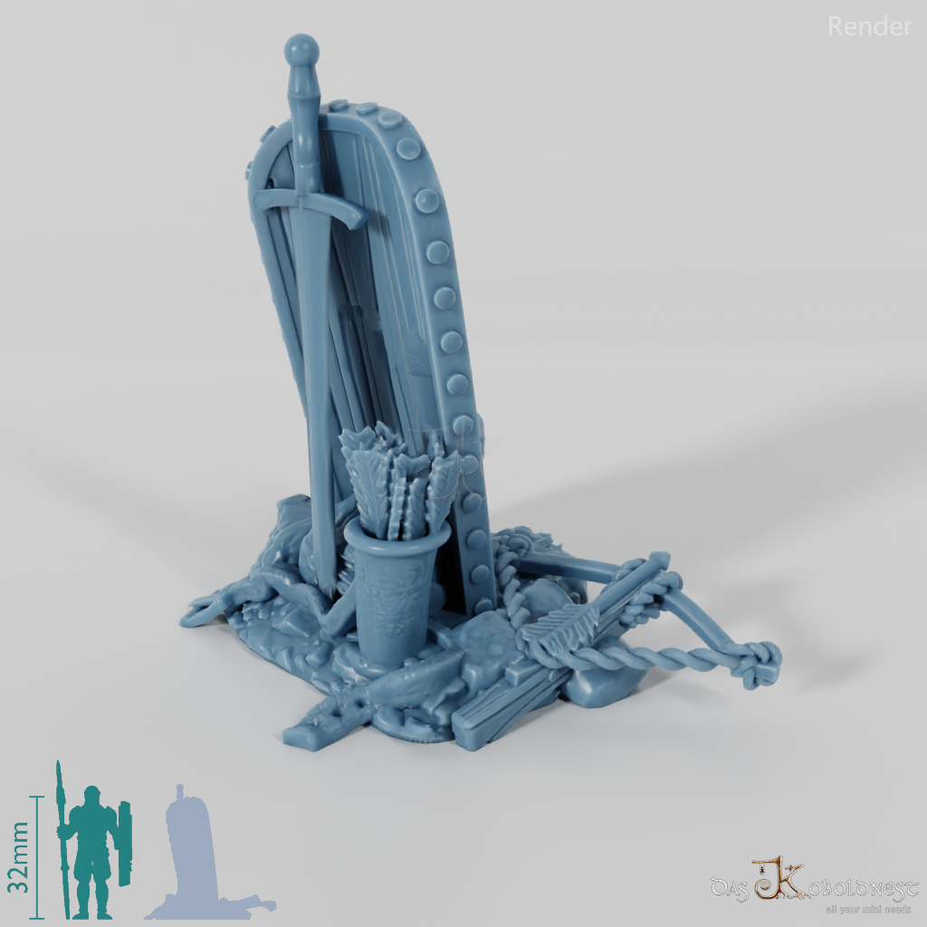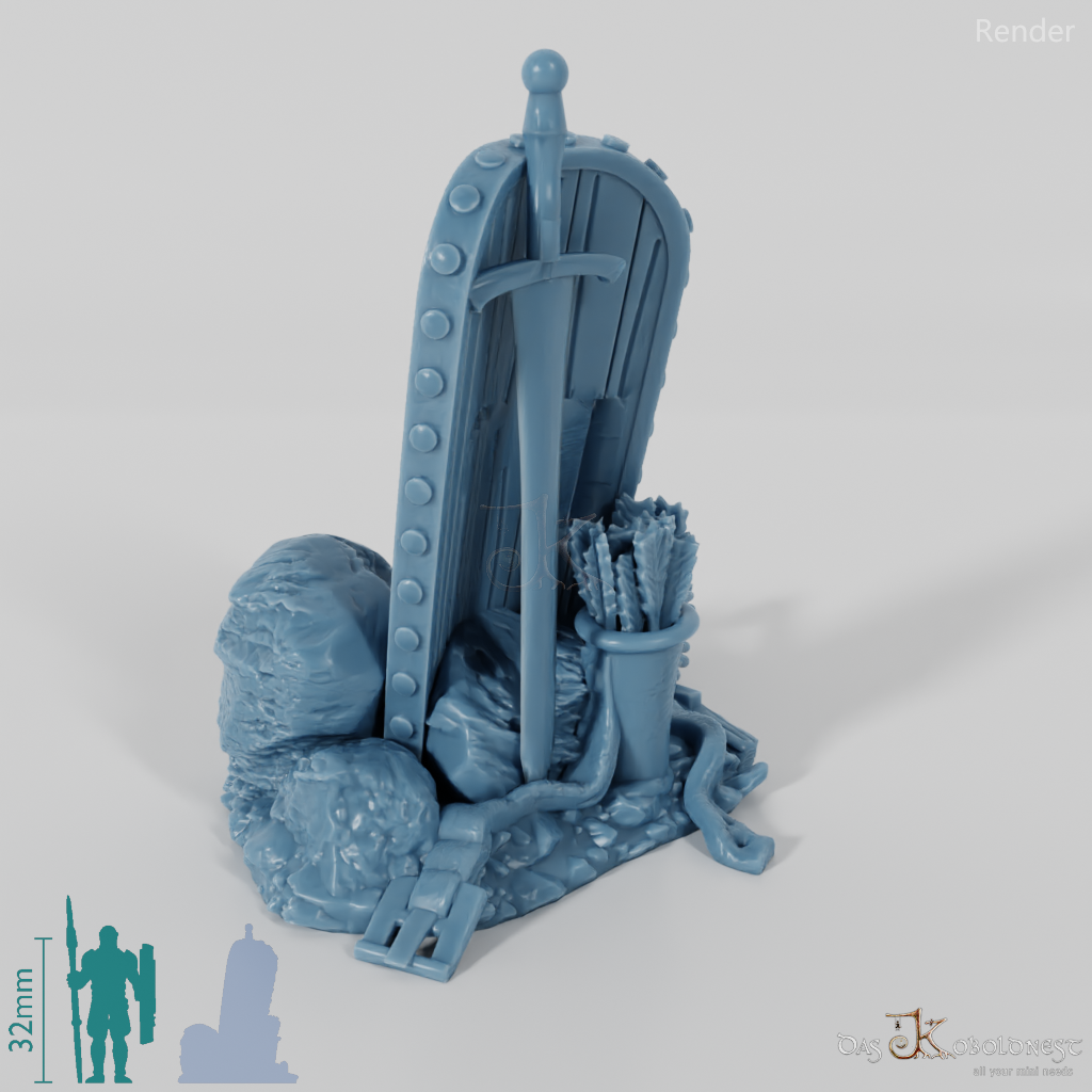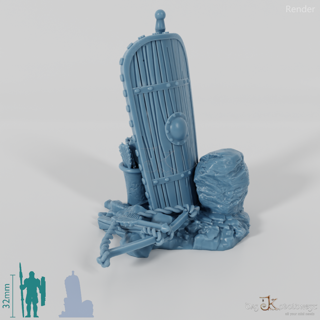 Von einem Steinbrocken gestützter, großer Schild, der aufrecht in der Erde Steckt und neben dem eine Armbrust und ein Bolzenköcher liegen
