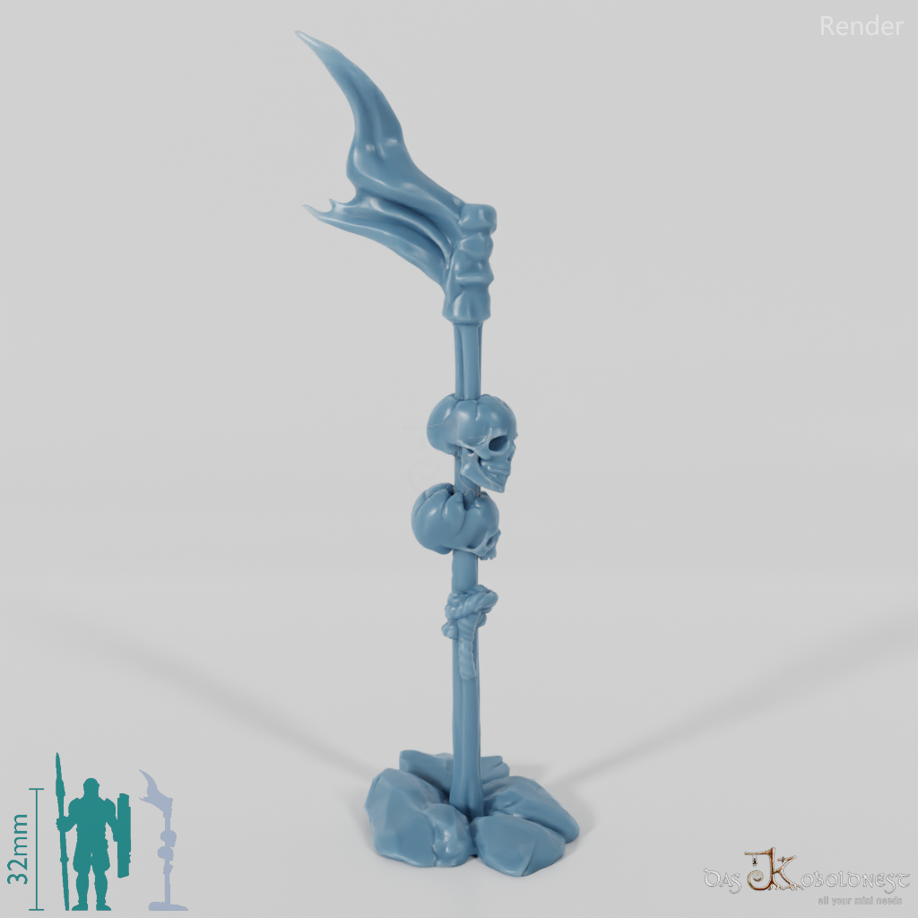 Zwischen Steinen stehende, brennende Fackel, auf deren Holz Menschenschädel stecken