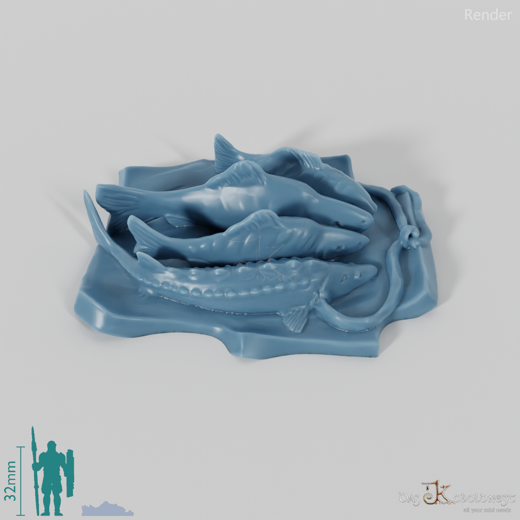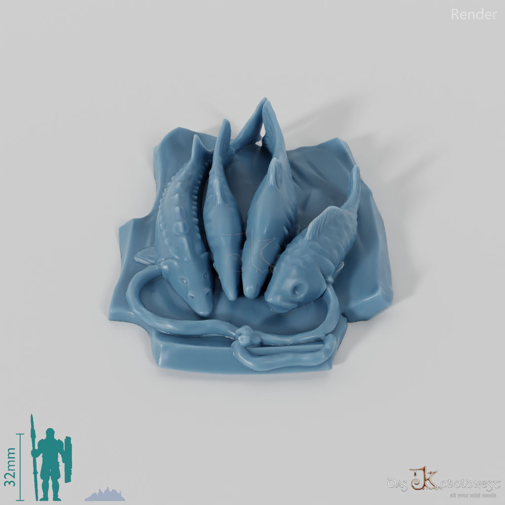 Vier an eine Lederschlaufe gebundene Fische, die auf einer dicken Tierhaut liegen.