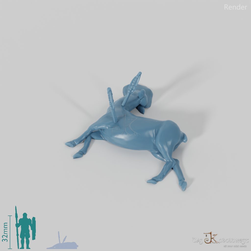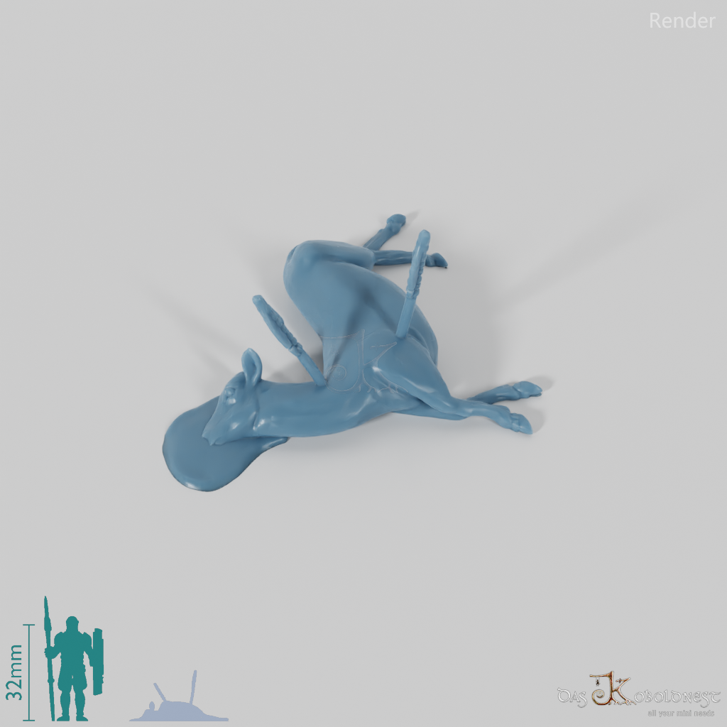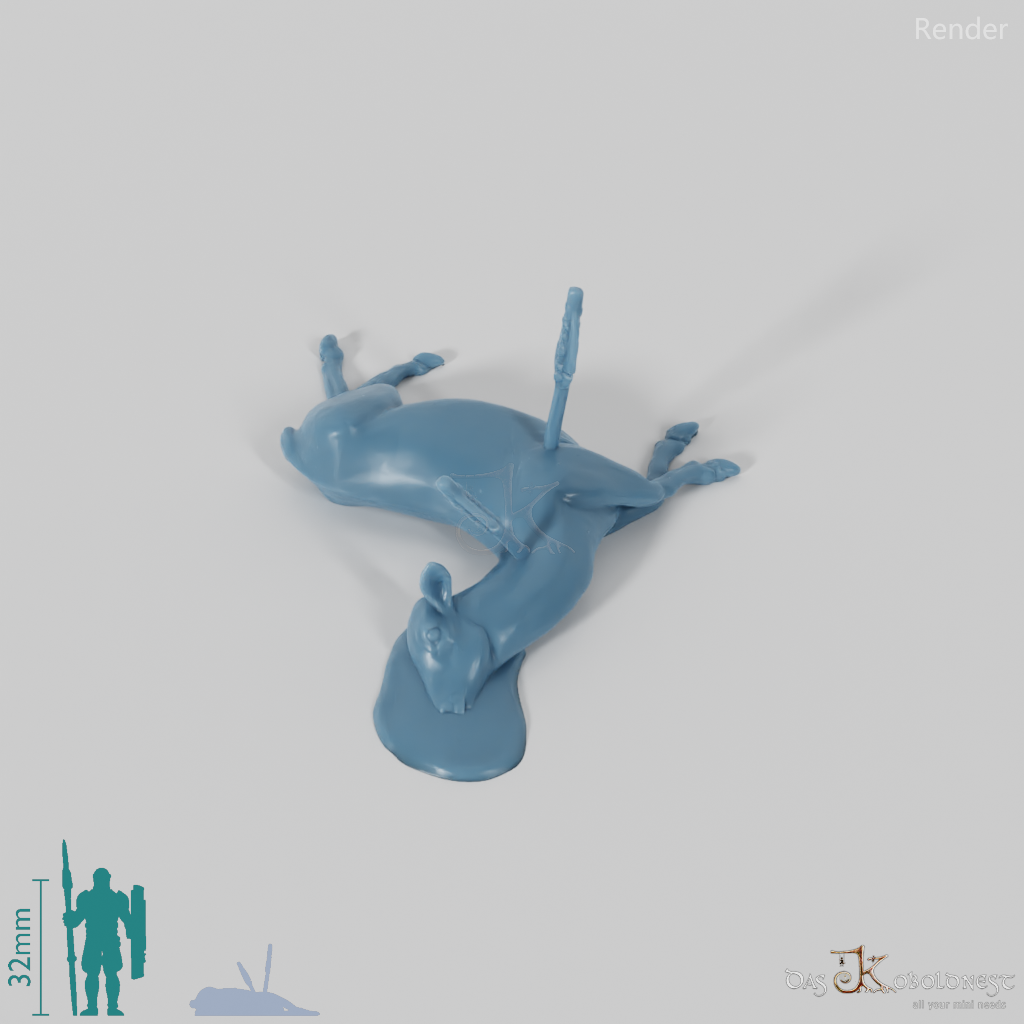 Totes, mit Pfeilen gespicktes Reh, das in einer Blutlache liegt.