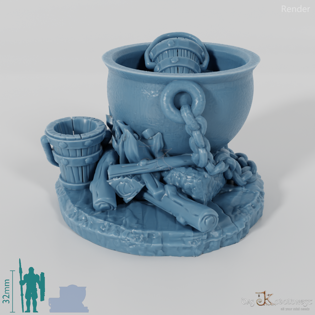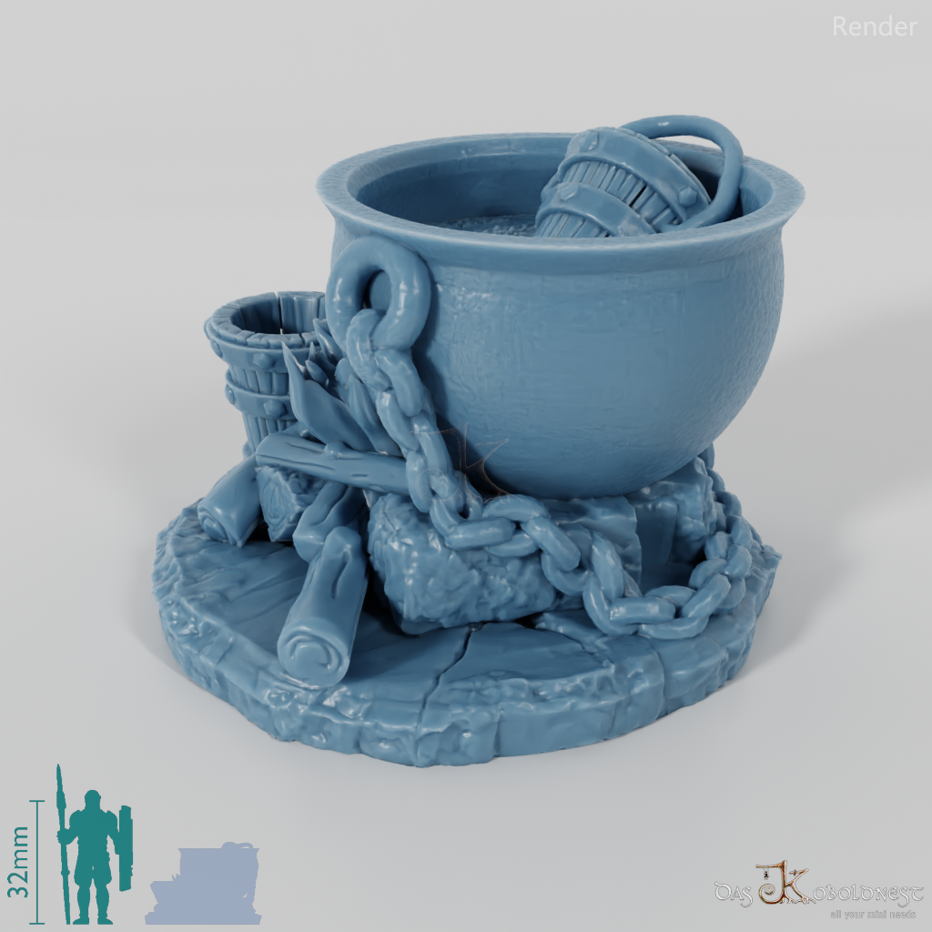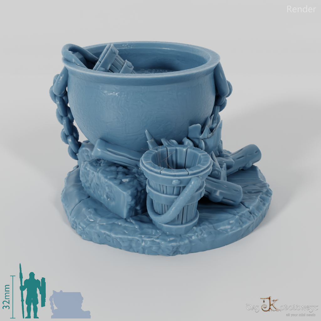 Großer, mit Öl gefüllter Kessel zum Imprägnieren, unter dem ein Feuer brennt und in dem ein Holzeimer treibt