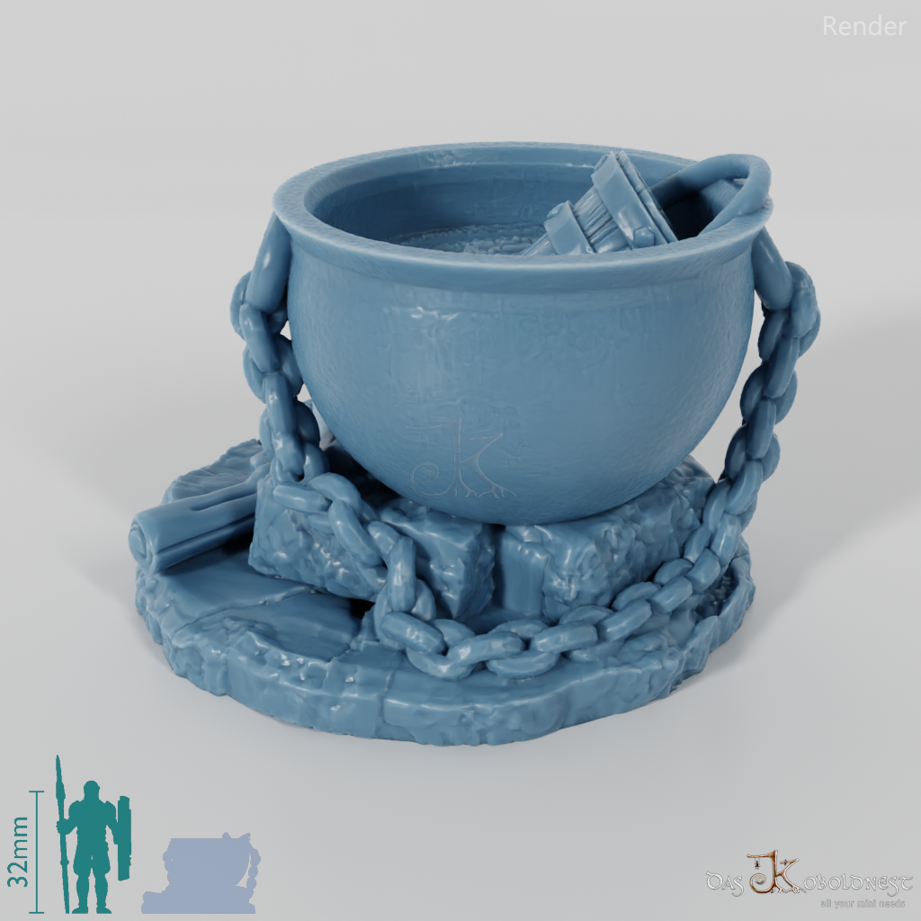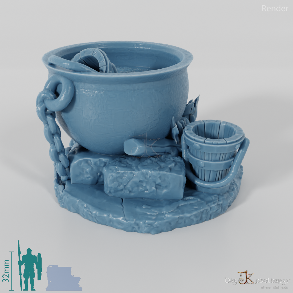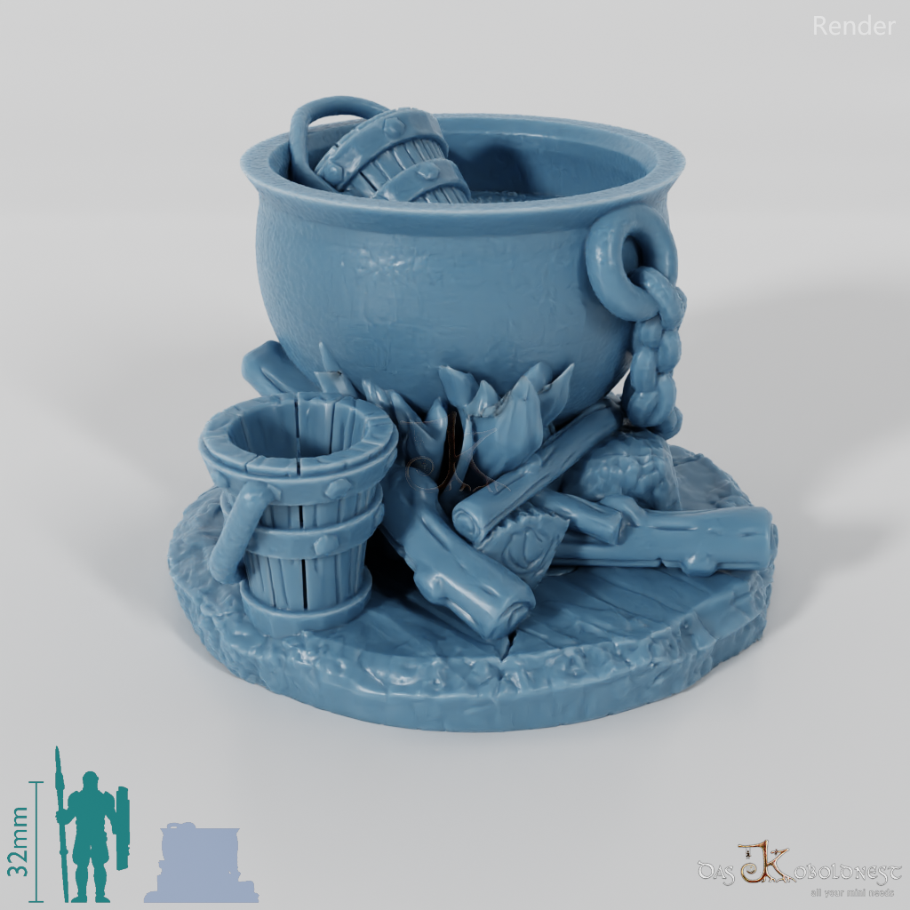 Großer, mit Öl gefüllter Kessel zum Imprägnieren, unter dem ein Feuer brennt und in dem ein Holzeimer treibt
