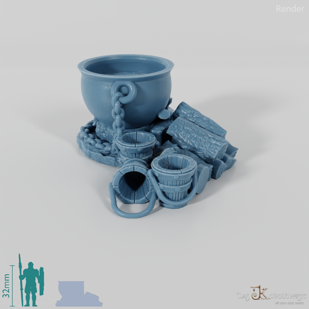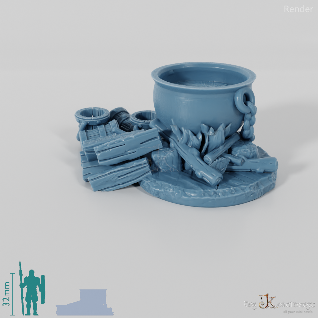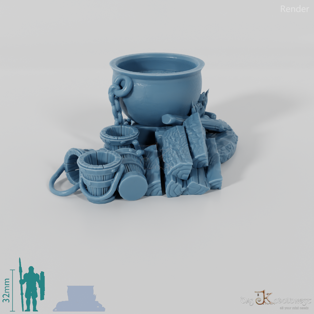 Großer, mit Öl gefüllter Kessel zum Imprägnieren, unter dem ein Feuer brennt und in dem ein Holzeimer treibt