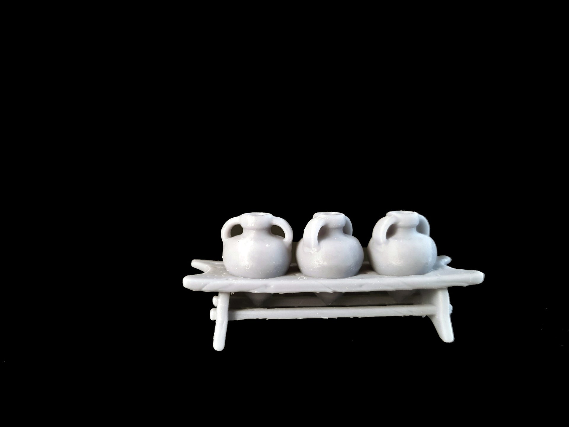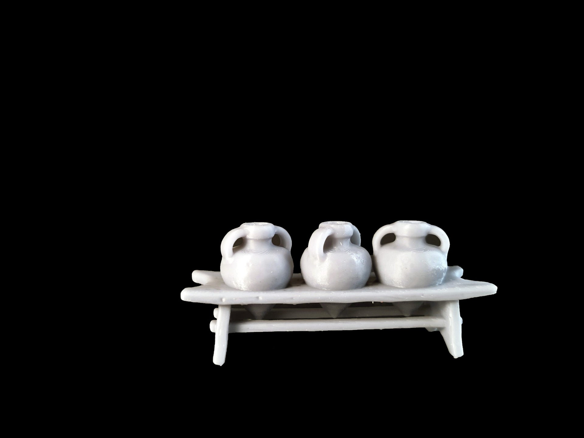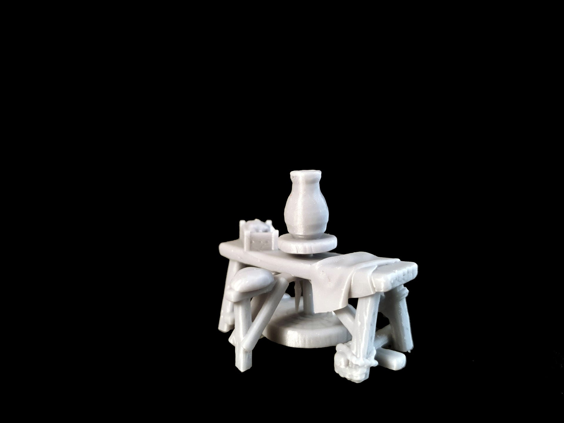 Einrichtung für eine Töpferstube. Artikel besteht aus Bank mit fußbetriebener Drehscheibe mit Vase und Kasten mit Lehm, Bank mit drei großen Amphoren, rundem Tuch, auf dem verschiedene Gefäße stehen, sowie rechteckigem Tuch mit hohen Flaschen und kleineren Gefäßen.   Model by STL Miniatures