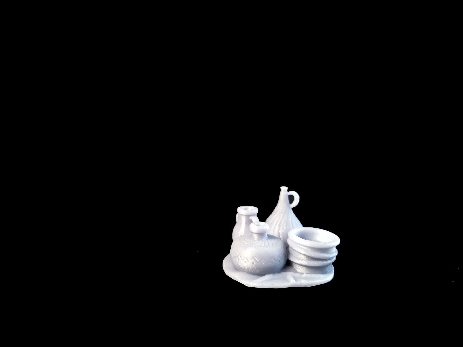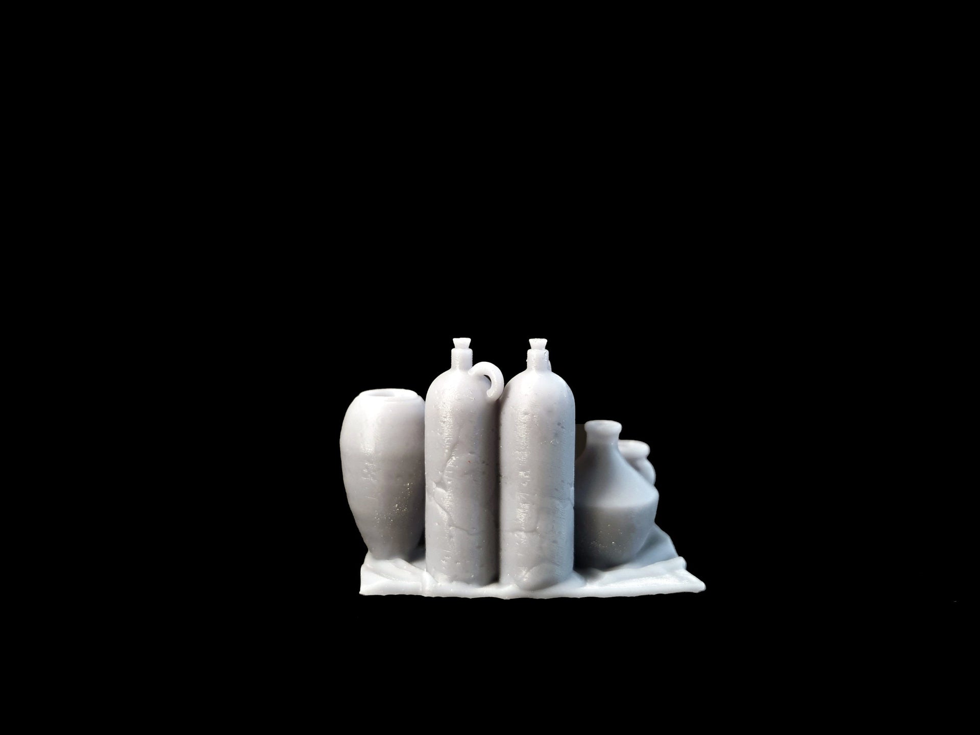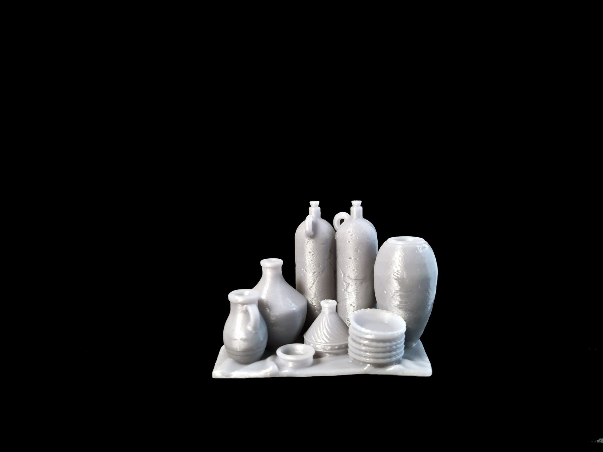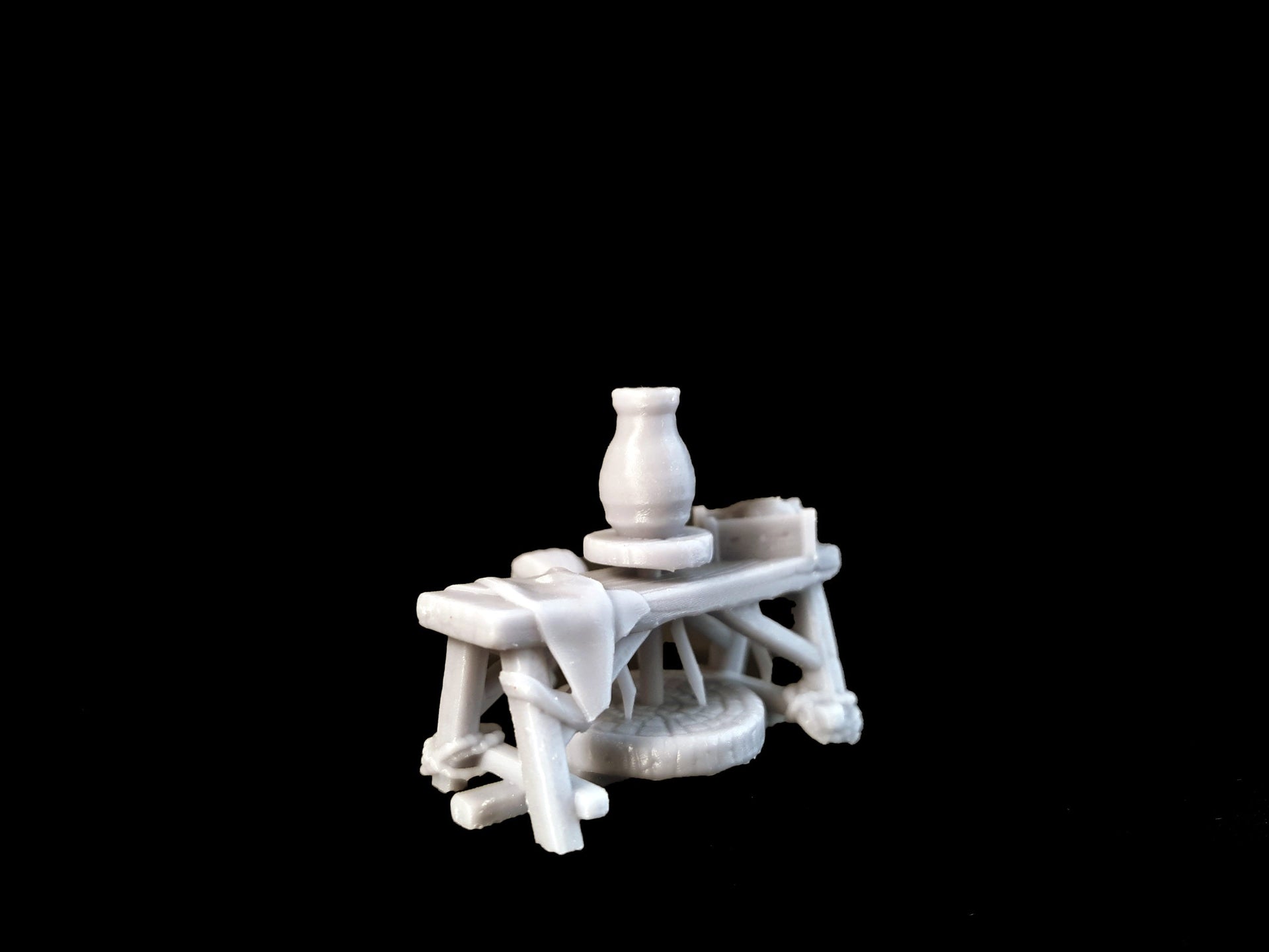 Einrichtung für eine Töpferstube. Artikel besteht aus Bank mit fußbetriebener Drehscheibe mit Vase und Kasten mit Lehm, Bank mit drei großen Amphoren, rundem Tuch, auf dem verschiedene Gefäße stehen, sowie rechteckigem Tuch mit hohen Flaschen und kleineren Gefäßen.   Model by STL Miniatures