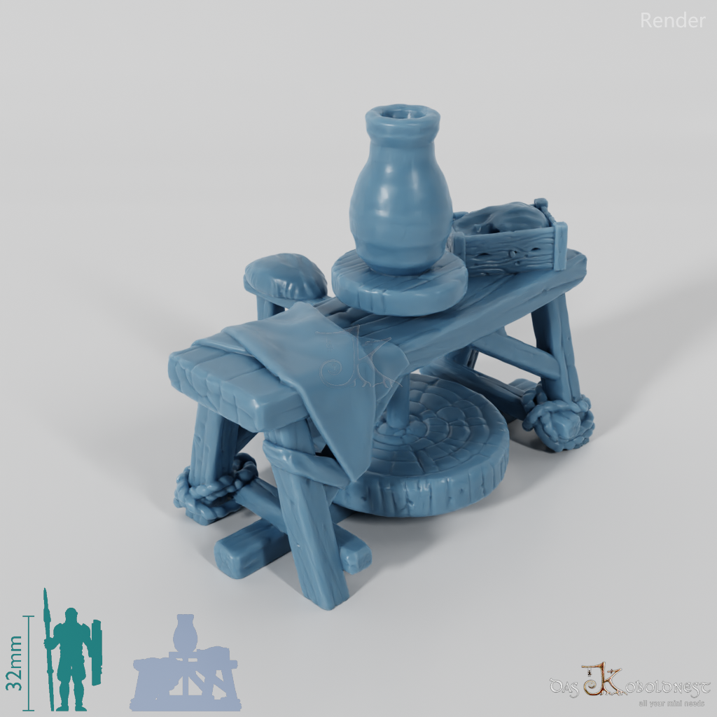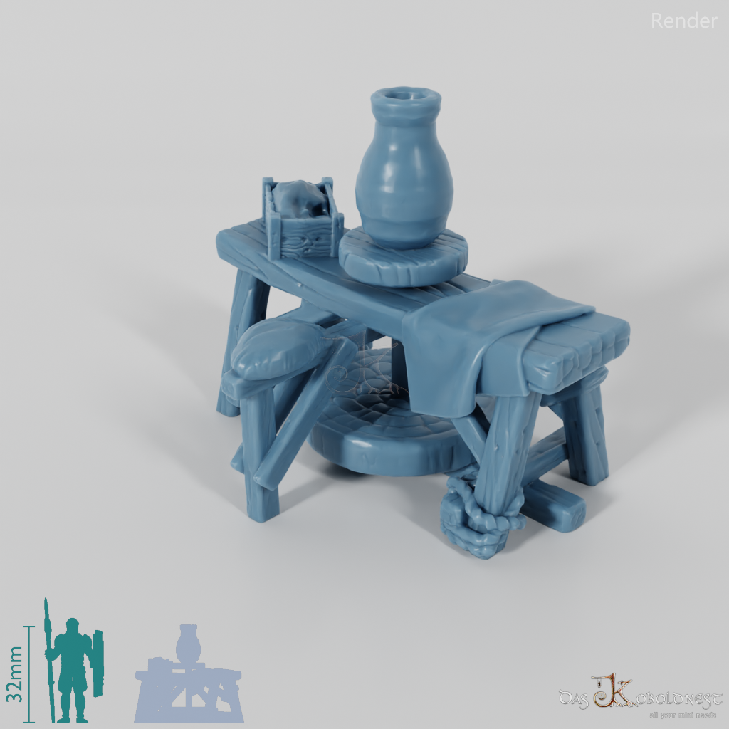 Holzbank mit Sitz und fußbetriebener Drehscheibe auf der ein Tongefäß steht. Daneben liegt ein Rahmen zum Formen von Tonziegeln Model by STL Miniatures