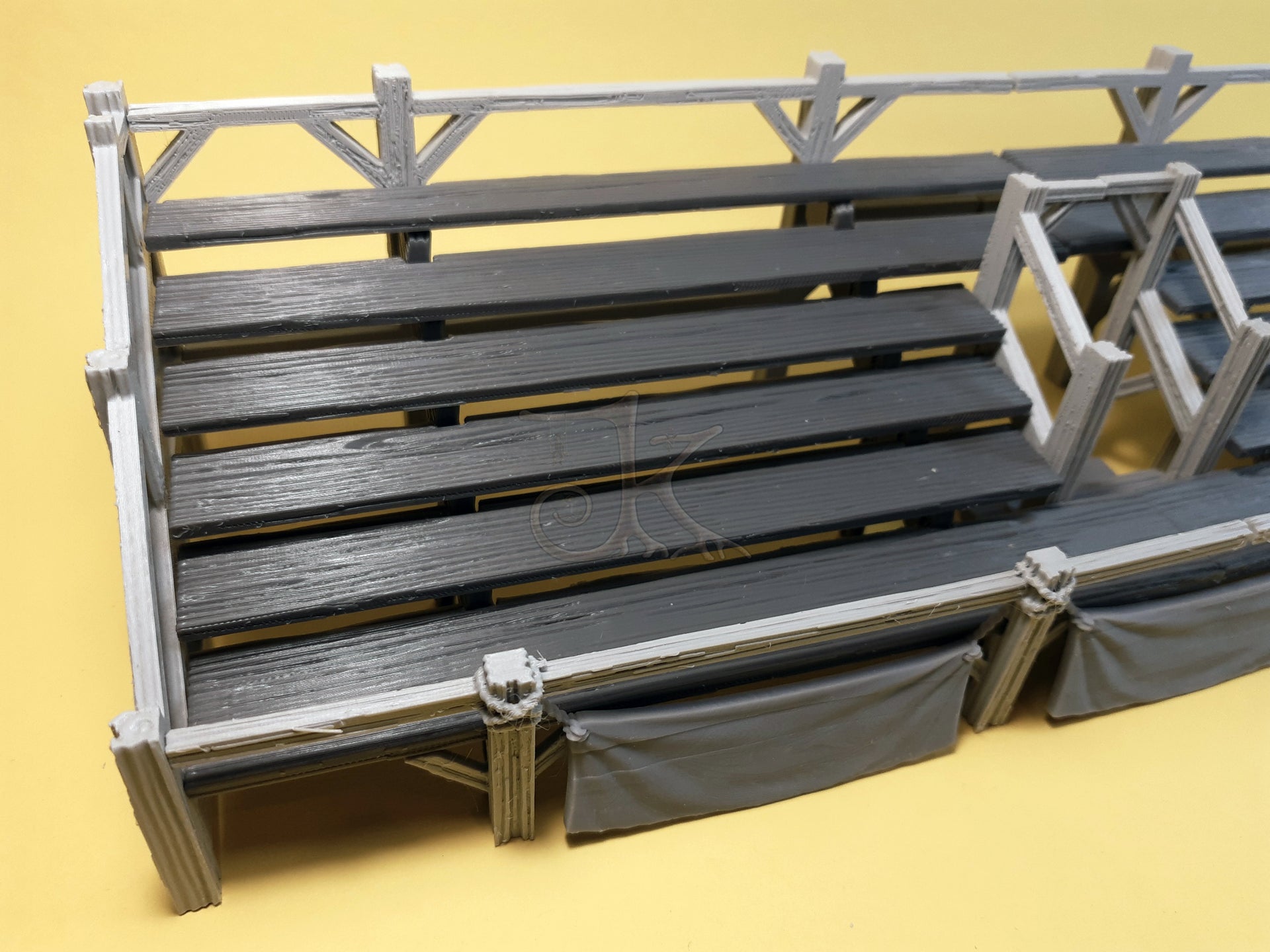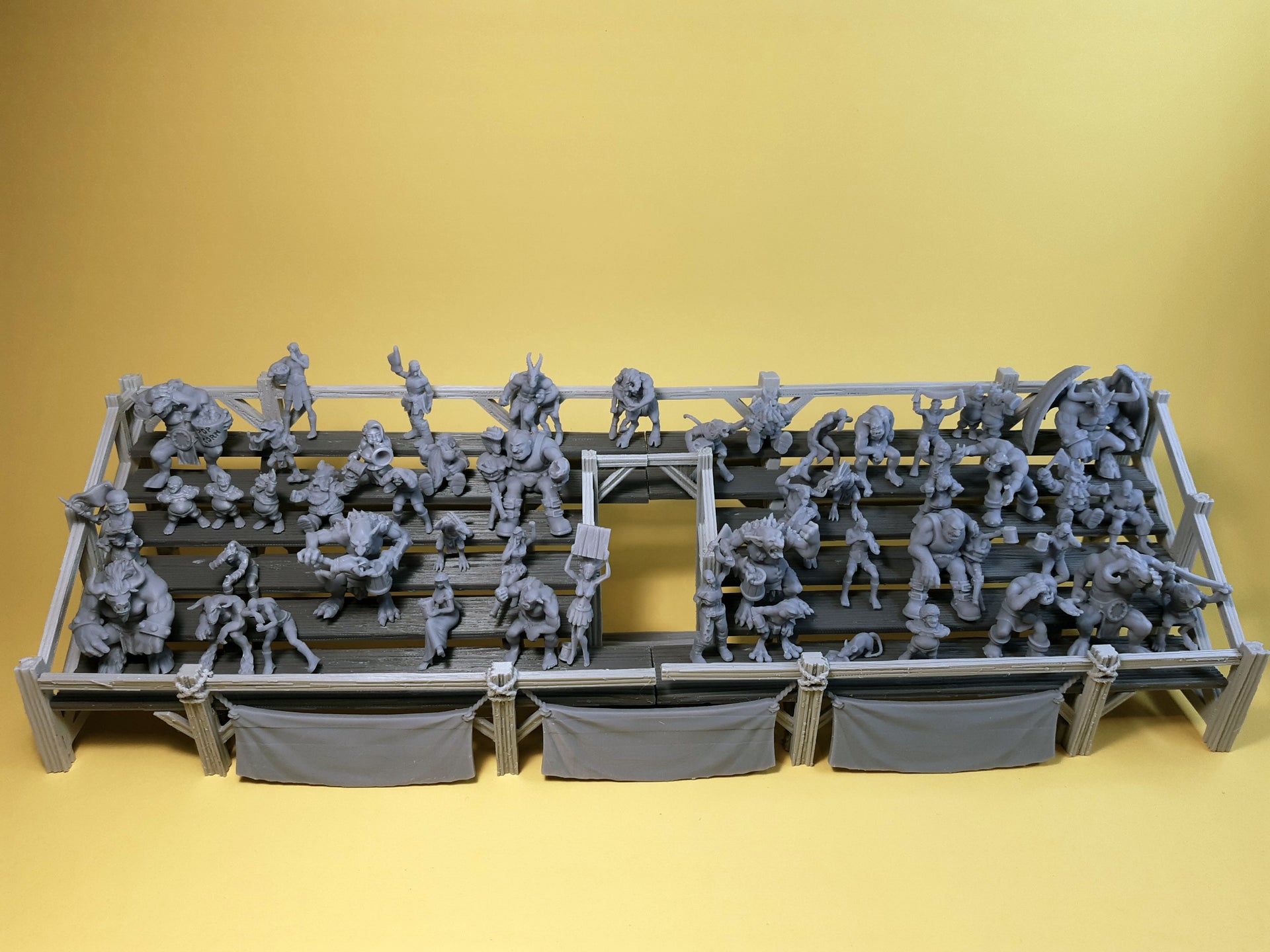 In Holzgerüst eingefasste, große, in der Mitte geteilte Tribüne mit zwei langen und acht kurzen Sitzbänken, mittlerem Treppenaufgang und drei Bannern. Die Tribüne hat eine Gesamtbreite von 40 cm, ist 10 cm hoch und 11 cm tief. Insgesamt bietet sie Platz für mehr als 50 von Fanath veröffentlichte Fantasy Football Zuschauer, womit alle zugehörigen Miniaturen mindestens ein Mal auf der Tribüne Platz haben. Banner und Treppenaufgang werden aus Resin gefertigt, alle anderen Teile aus PLA. Model by Fanath