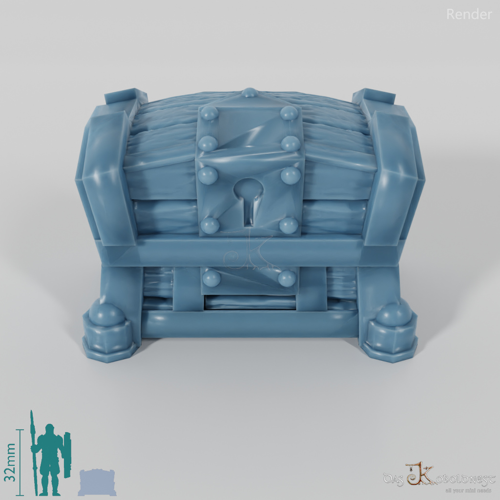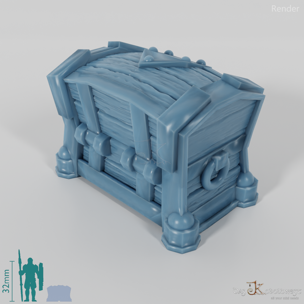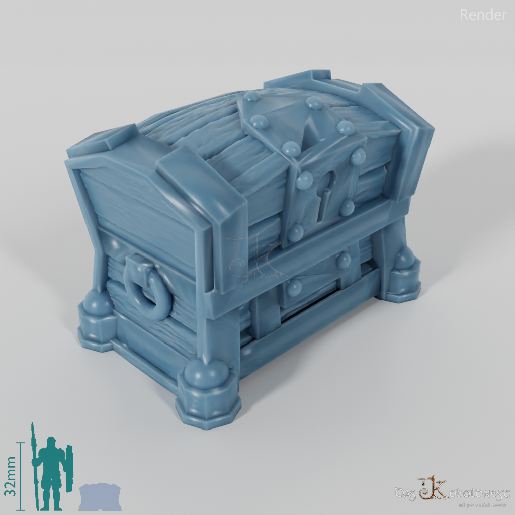 Kleine, eisenbeschlagene Schatzkiste aus Holz.   Modell: treasure chest by Kinower, lizenziert unter CC BY 3.0.