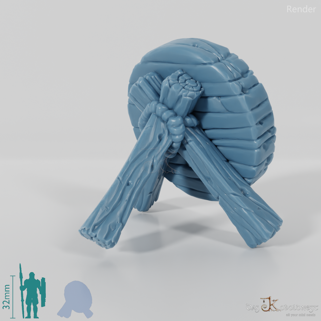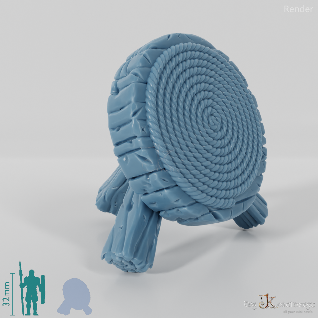 Große, hölzerne Konstruktion mit kreisförmig gewickeltem Tau als Zielscheibe