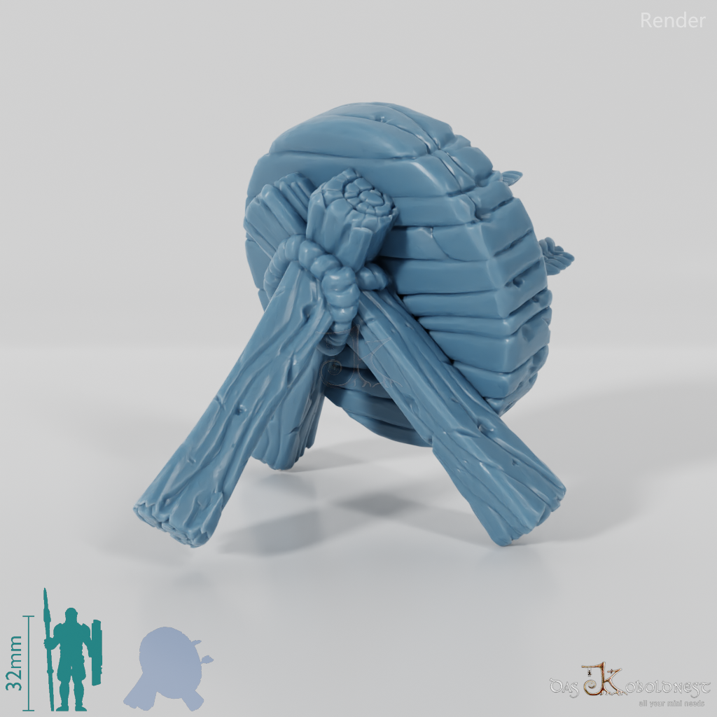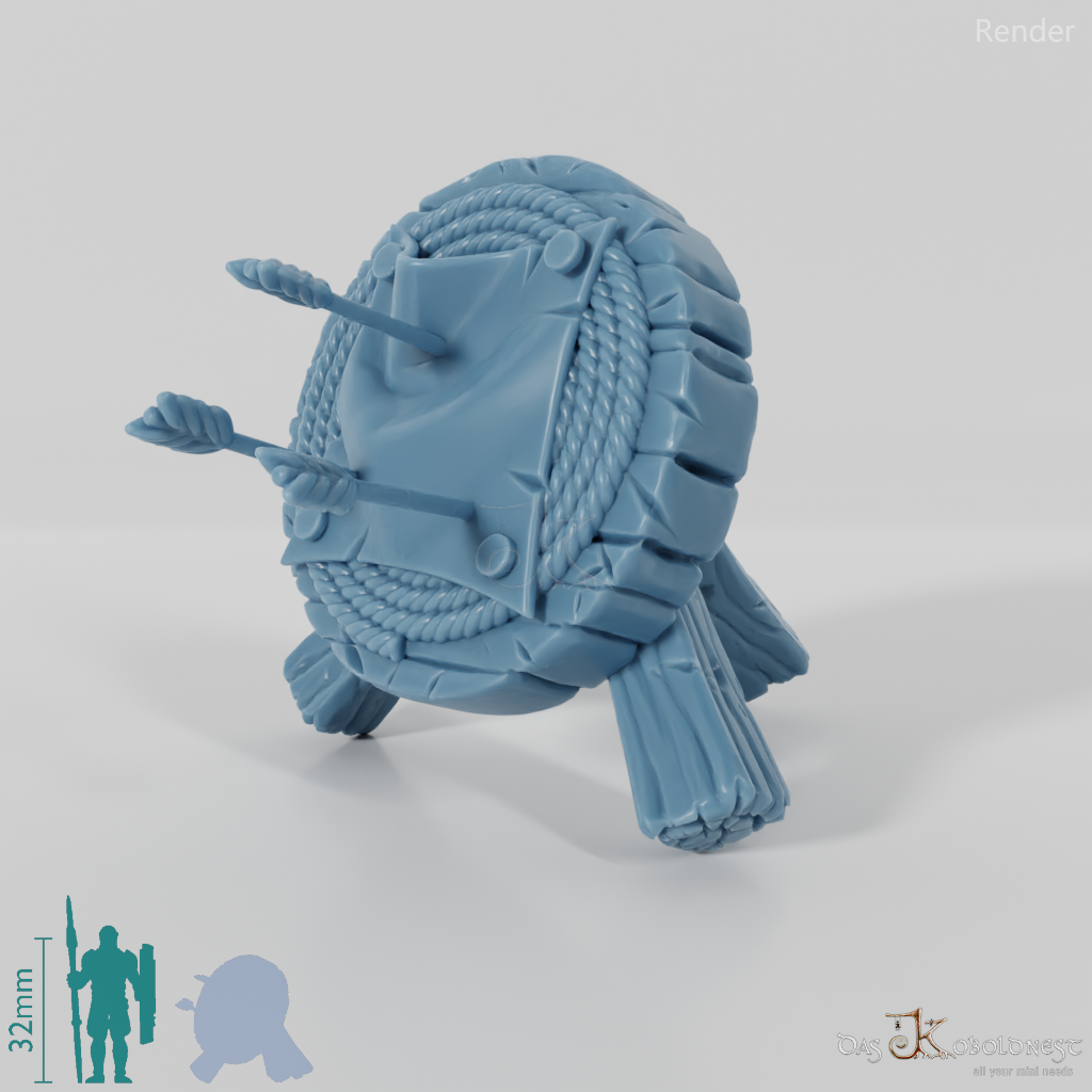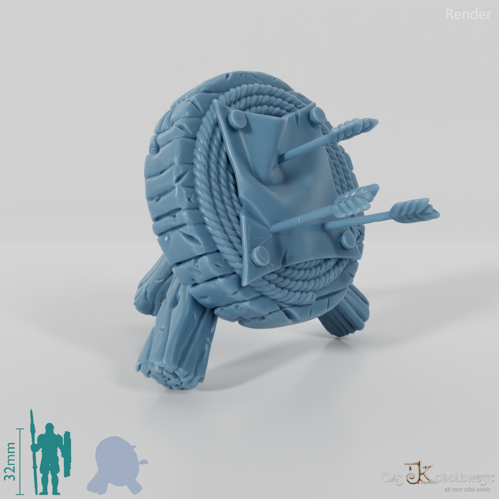Große, hölzerne Konstruktion mit kreisförmig gewickeltem Tau als Zielscheibe, in der Pfeile stecken