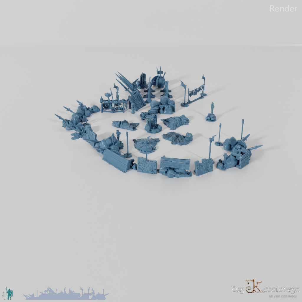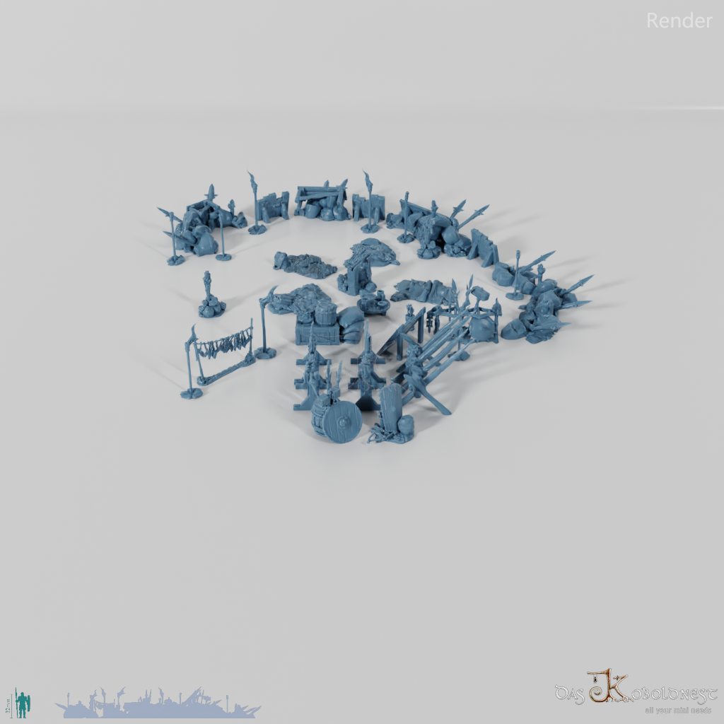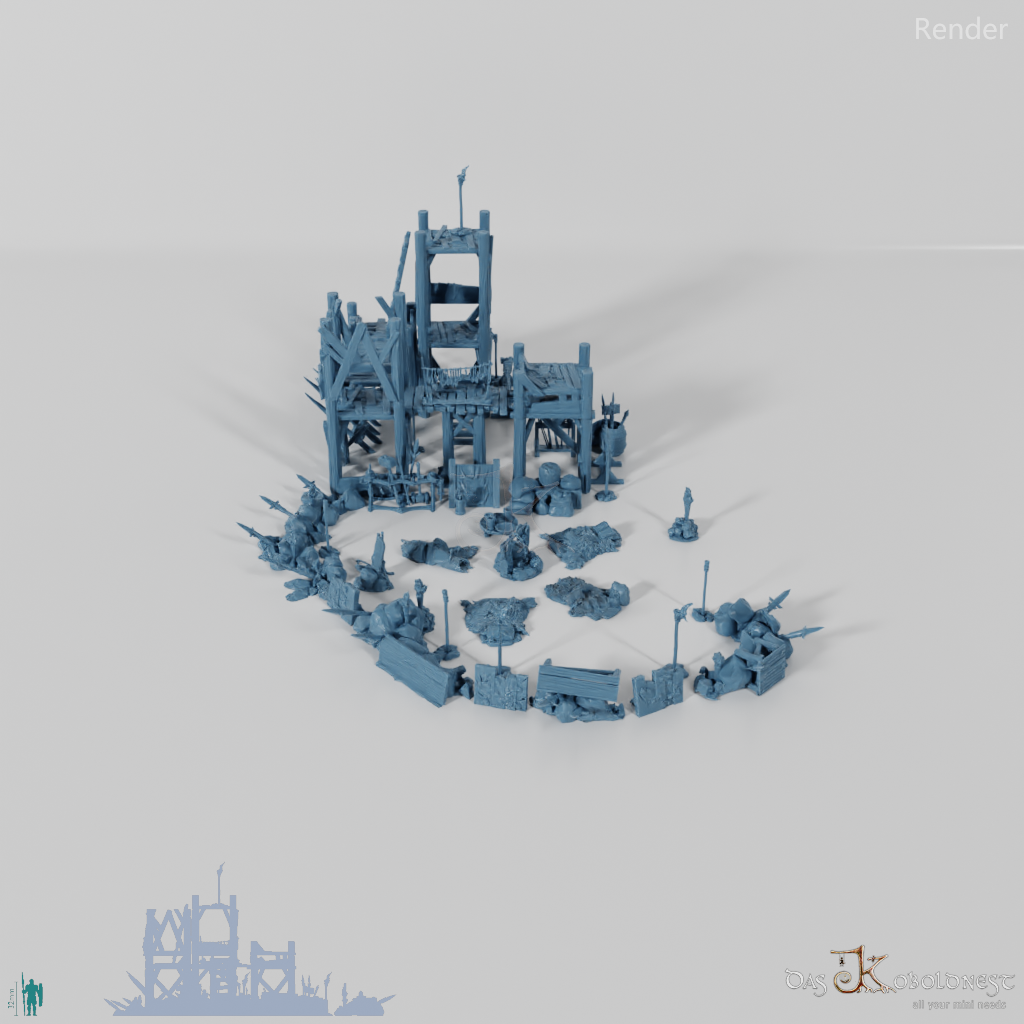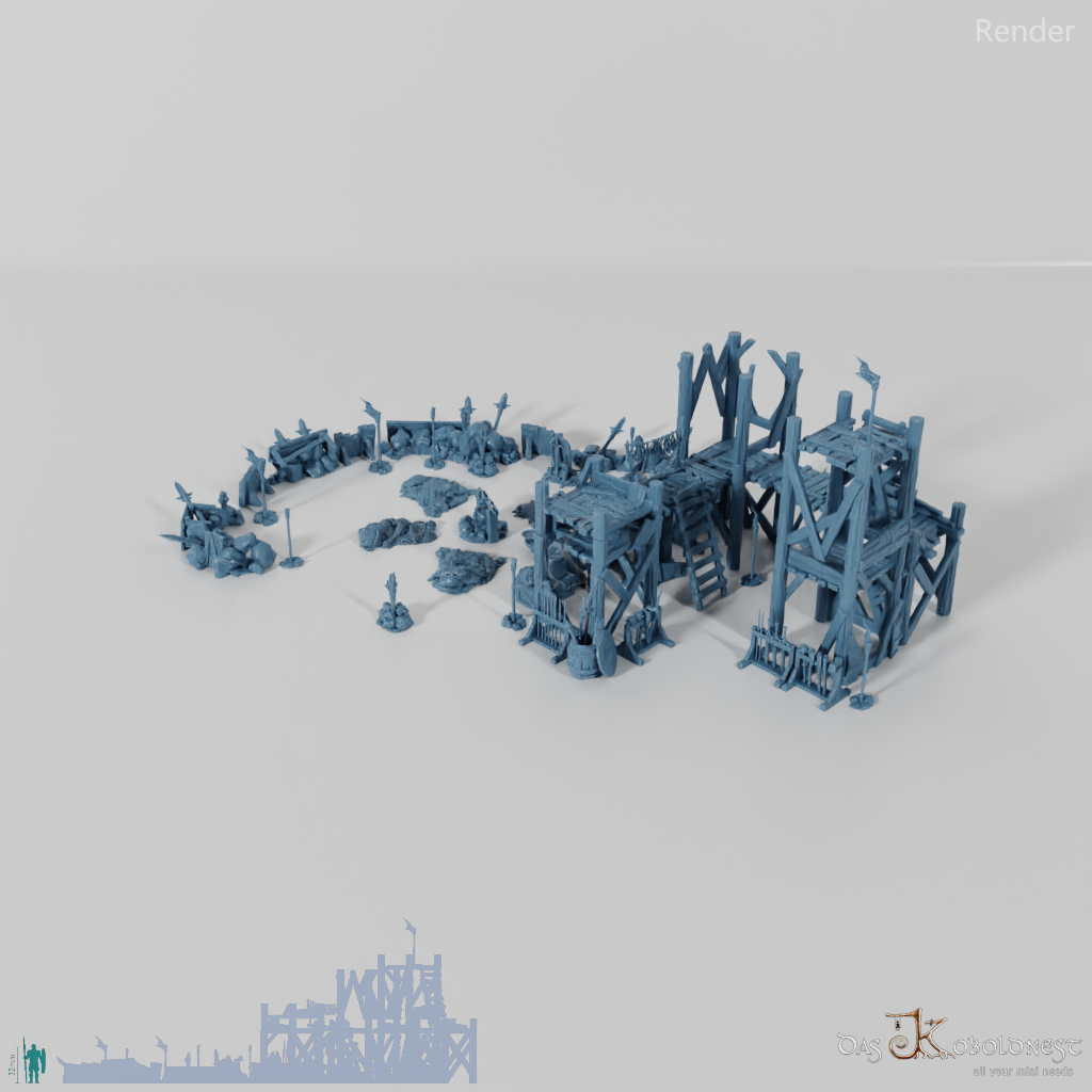Alle Kleinteile sind aus Resin gefertigt, das modulare Holzgerüst aus PLA. Das Komplettset besteht aus 55 Einzelteilen, die beliebig für Diorama- und Geländebau im 28-32mm Maßstab verwendet werden können.
