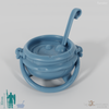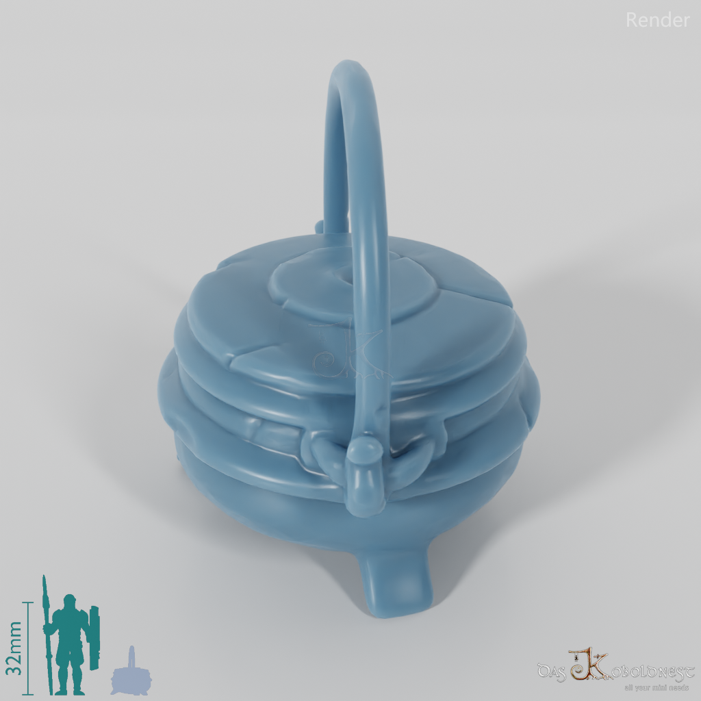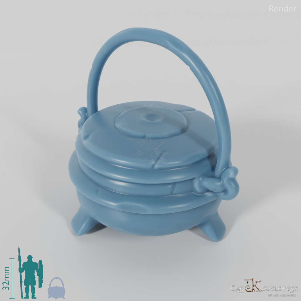 Großer Topf mit Deckel und hochstehendem Henkel, der über ein Feuer gehängt werden kann