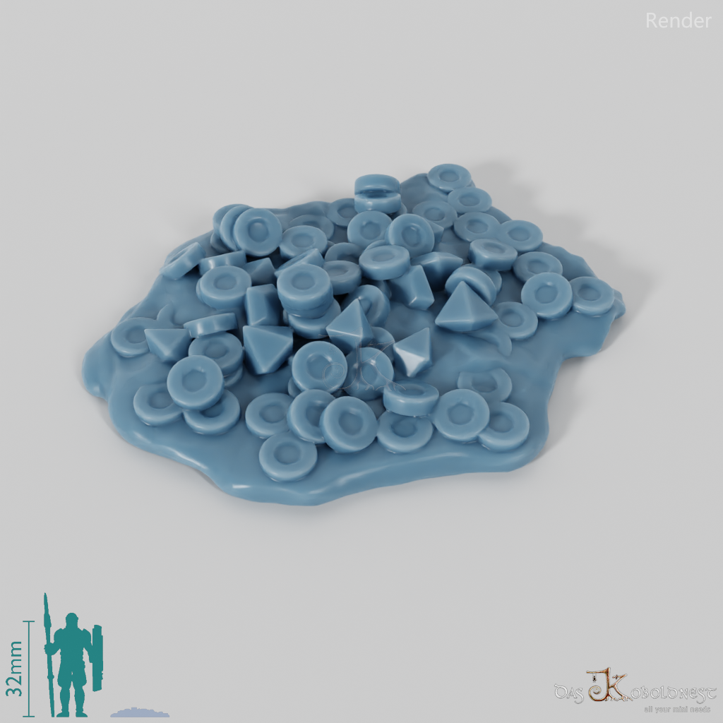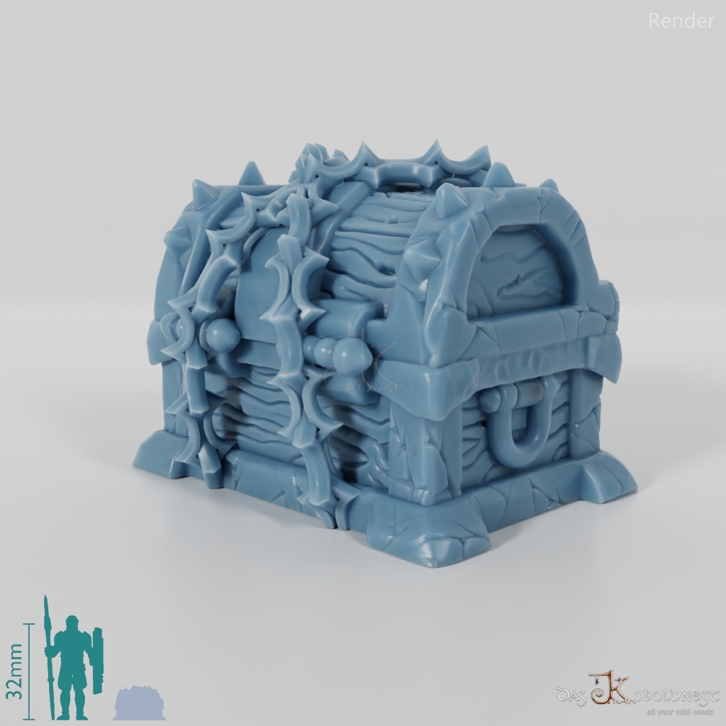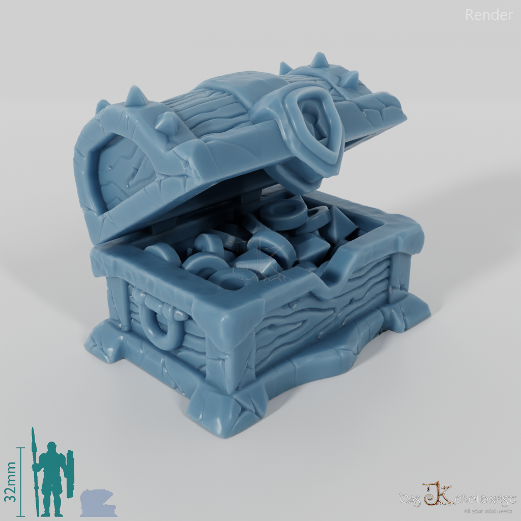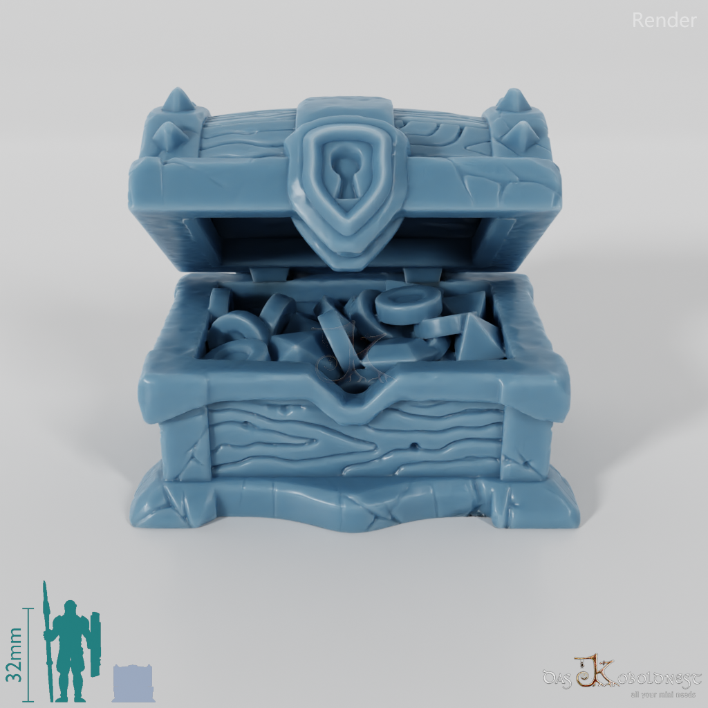 Schätze und Truhen zur Einrichtung einer Schatzkammer. Artikel besteht aus geschlossener Truhe, offener Truhe mit Münzen, zwei kleinen Münzhaufen, einem mittelgroßen Münzhaufen mit Edelsteinen und Geschirr, sowie einen riesigen Schatzhaufen mit verschiedensten Gegenständen.