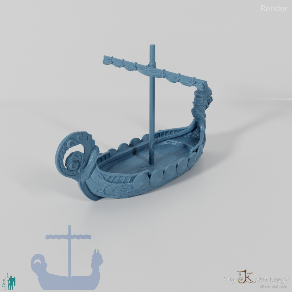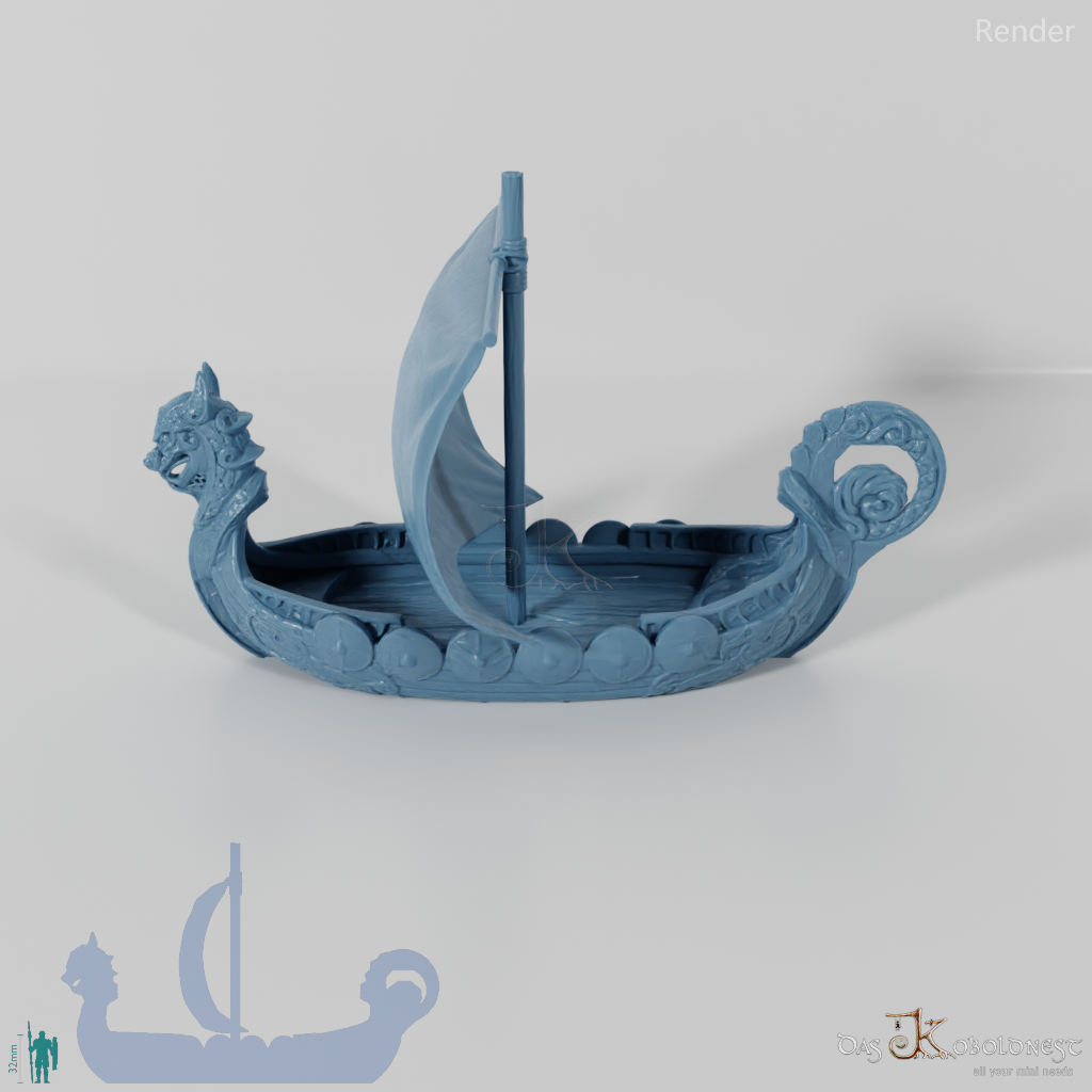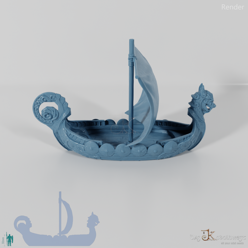 Mit Rundschilden gesäumtes Drachenboot mit kunstvollen Schnitzereien. Modell wird sowohl mit eingerolltem, als auch mit niedergelassenem Segel geliefert.