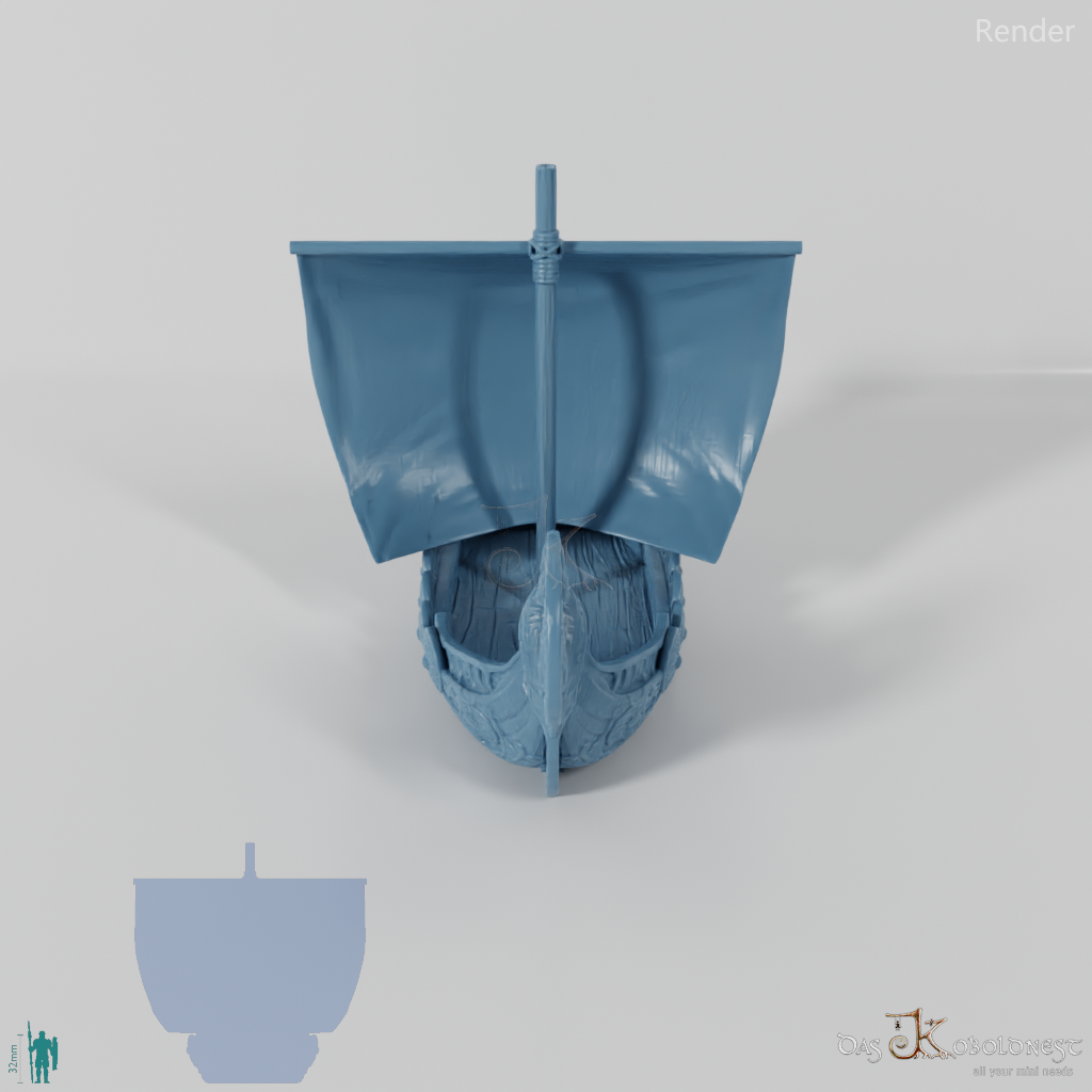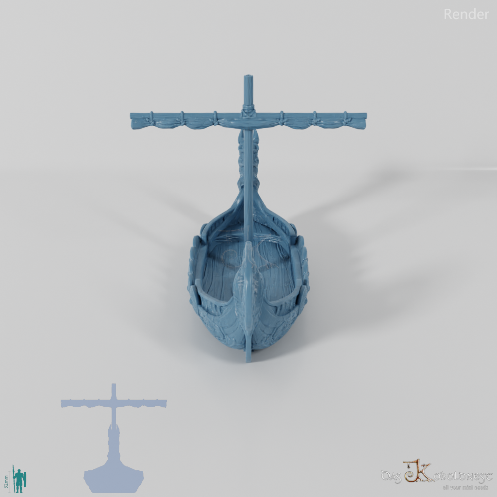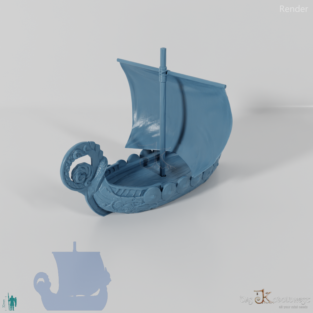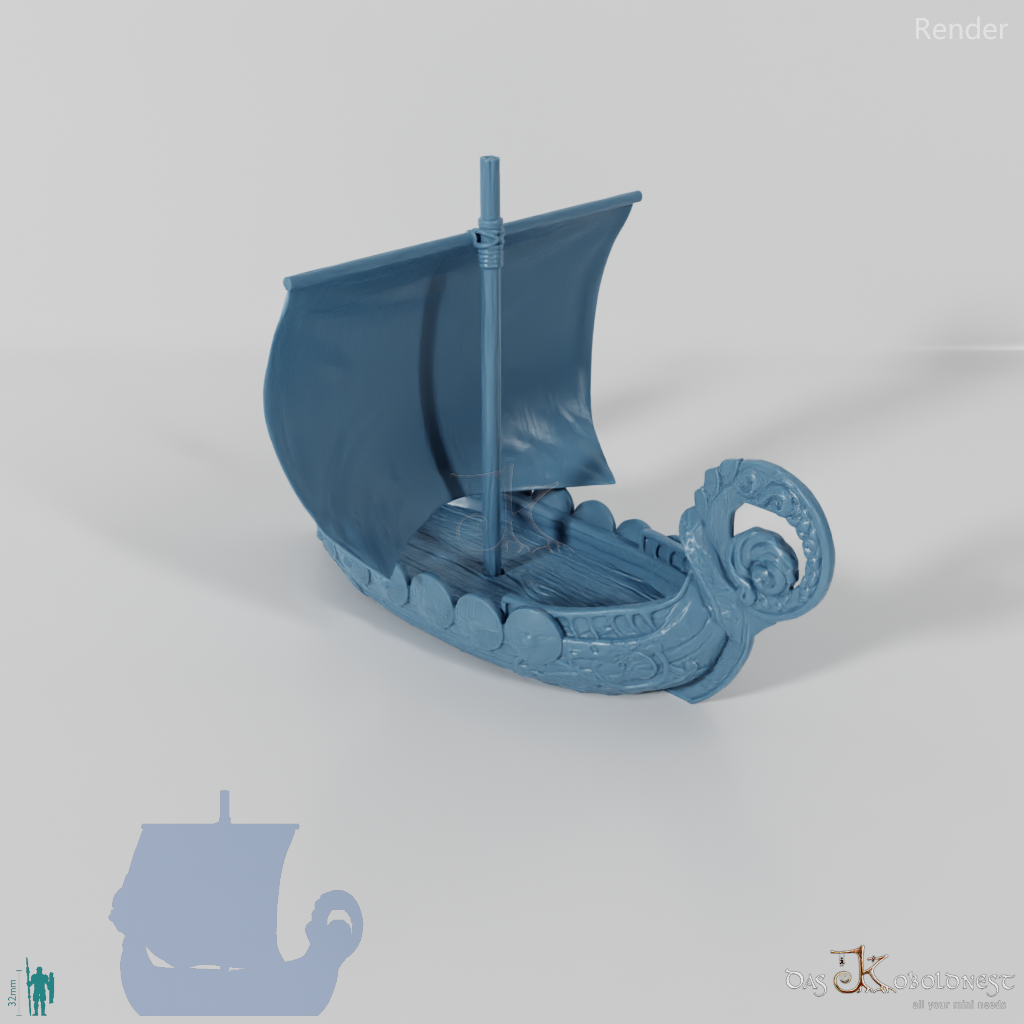 Mit Rundschilden gesäumtes Drachenboot mit kunstvollen Schnitzereien. Modell wird sowohl mit eingerolltem, als auch mit niedergelassenem Segel geliefert.