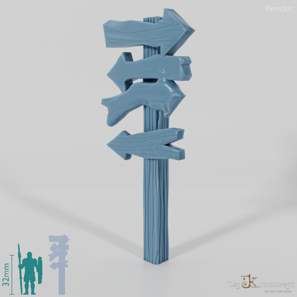 Hölzerner Wegweiser mit Richtungsschildern in Form großer Pfeile