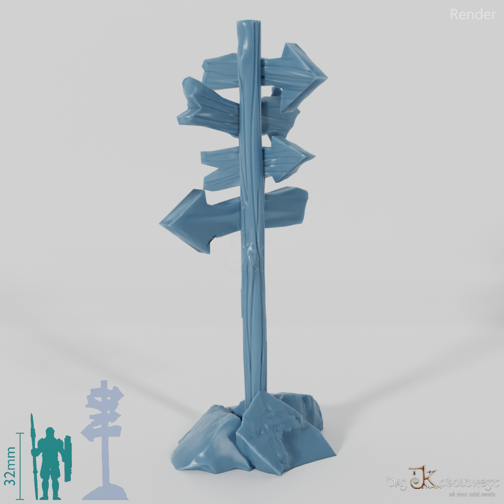 Hölzerner Wegweiser mit Richtungsschildern in Form großer Pfeile, der zwischen großen Steinen steht