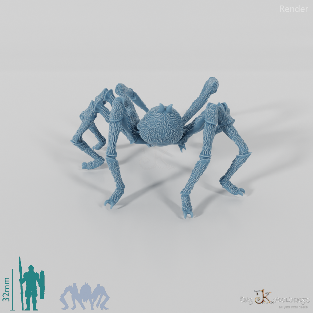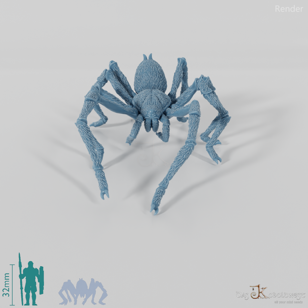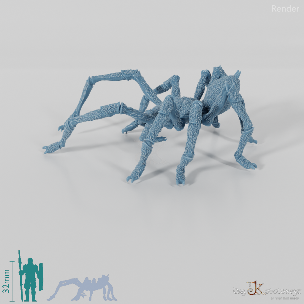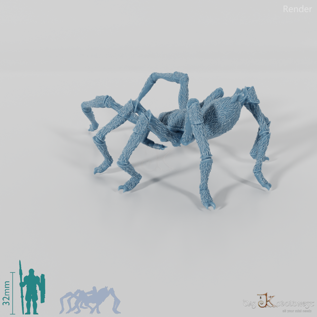 Riesenspinne mit haarigem Körper und Beinen. Modell passt knapp auf eine 40mm-Rundbase und bequem auf 50- und 60mm-Rundbases.