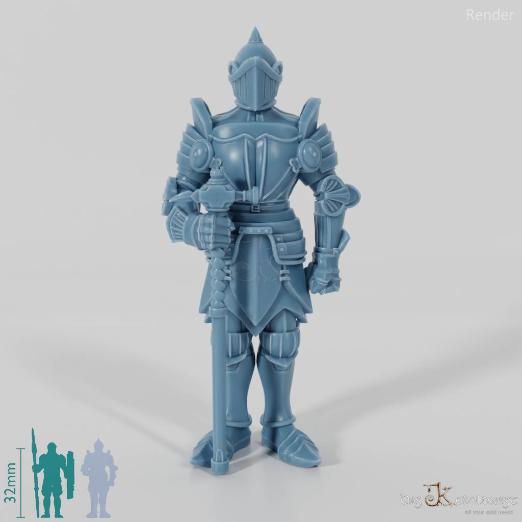 Gerade stehende Gestalt in voller Plattenrüstung, die einen Hammer hält