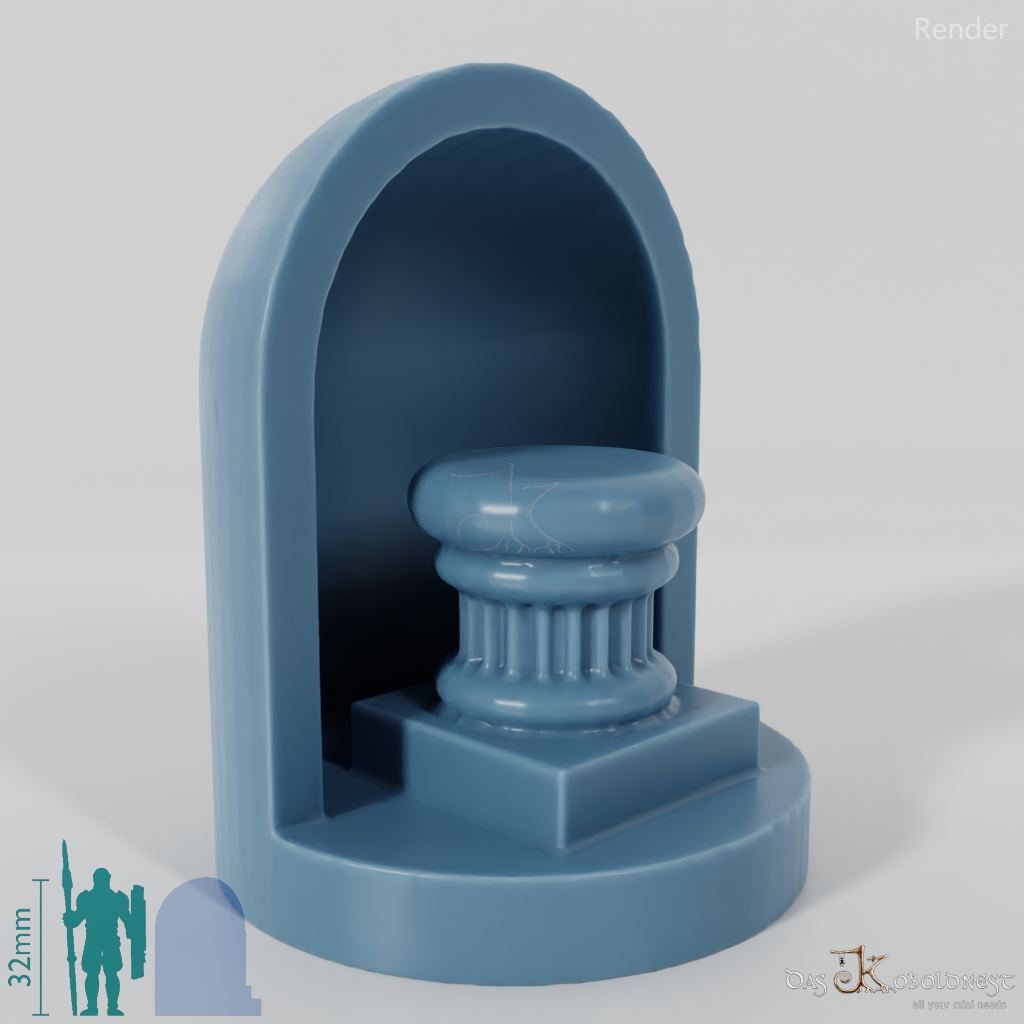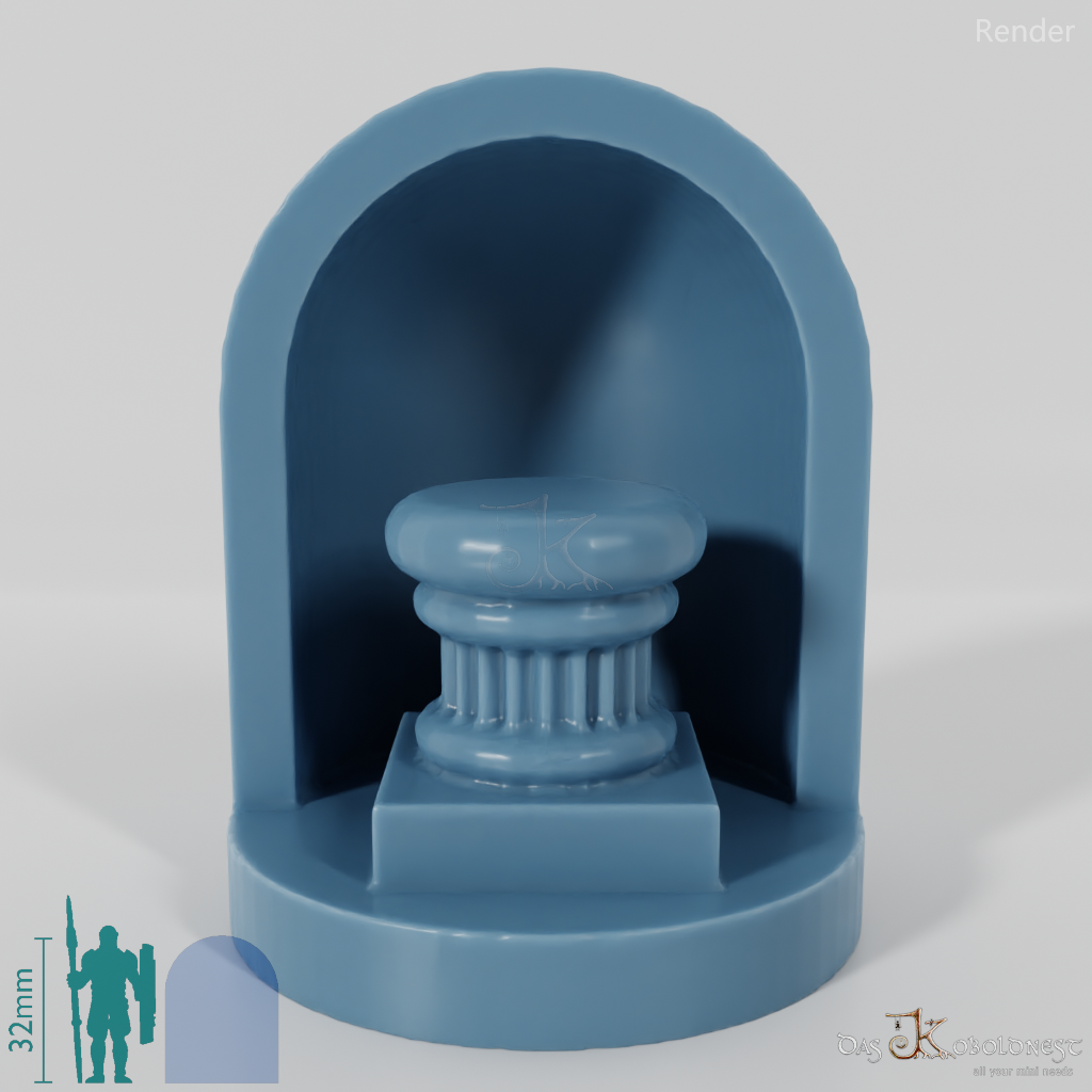 Kleiner, geschützter Schrein mit leerem Steinpodest.   Modell: Basic Shrine by tshenry1, lizenziert unter CC BY 3.0.