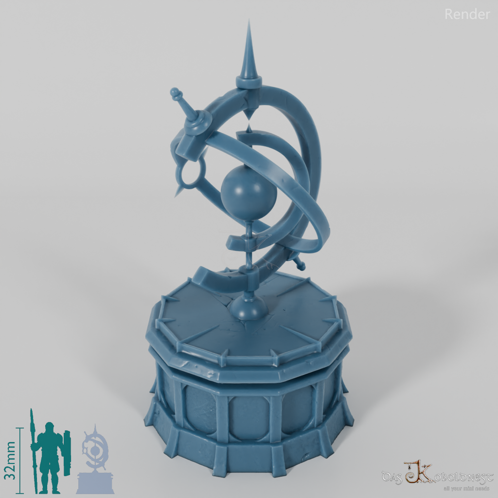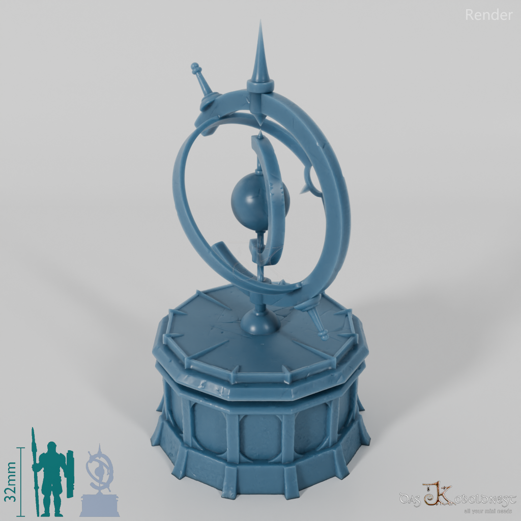 Dieses kunstvoll gestaltete Astrolabium mit mehreren rotierten Achsen, montiert auf einem verzierten Steinsockel, ist ein unverzichtbares Werkzeug für die Erforschung der Himmelskörper.