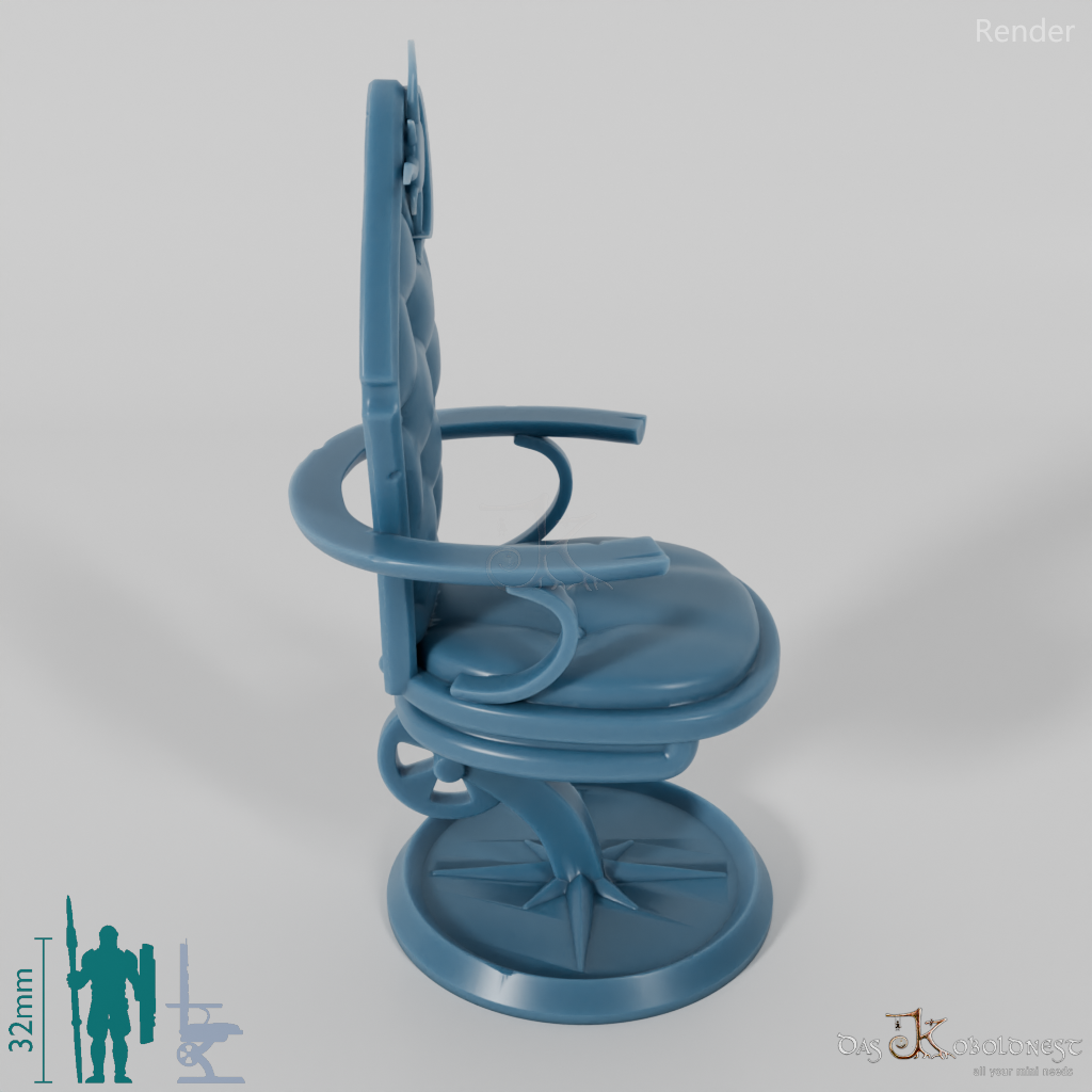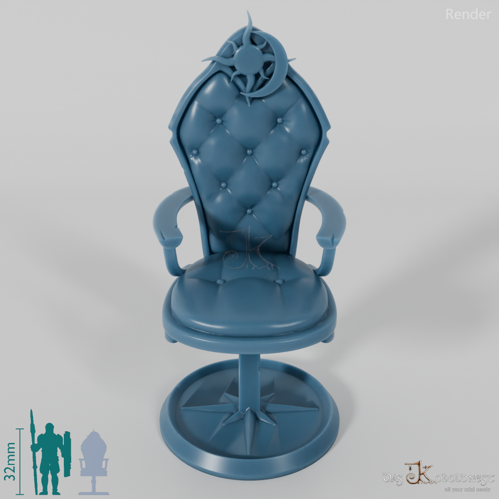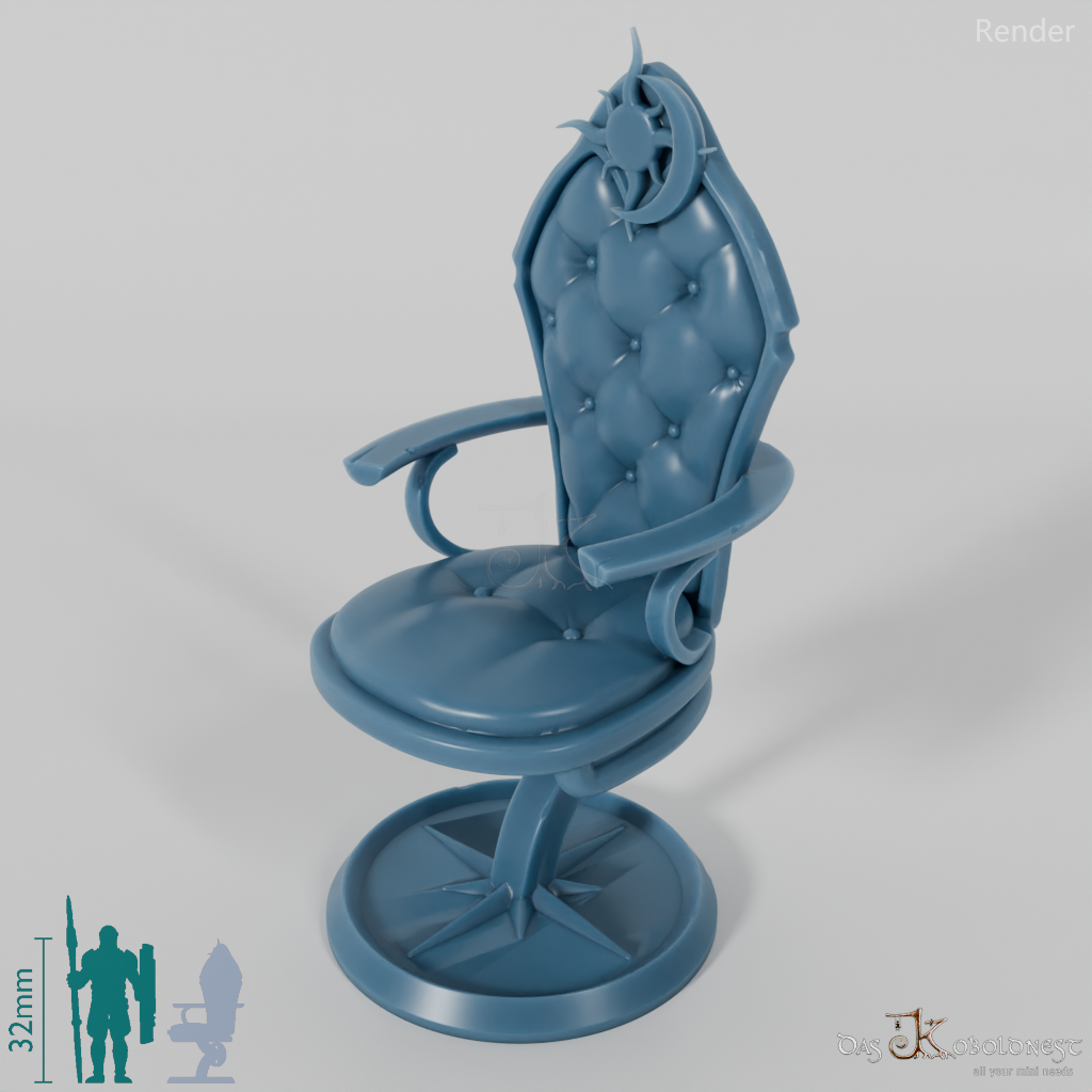 Dieser komfortable, gepolsterte Stuhl mit Armlehnen und einem Sonnensymbol auf der Rückenlehne fügt jedem Set Eleganz und Komfort hinzu. Er ist der perfekte Platz für deine Astronomen um sich auf ihre nächtlichen Beobachtungen vorzubereiten.