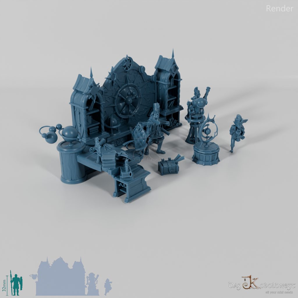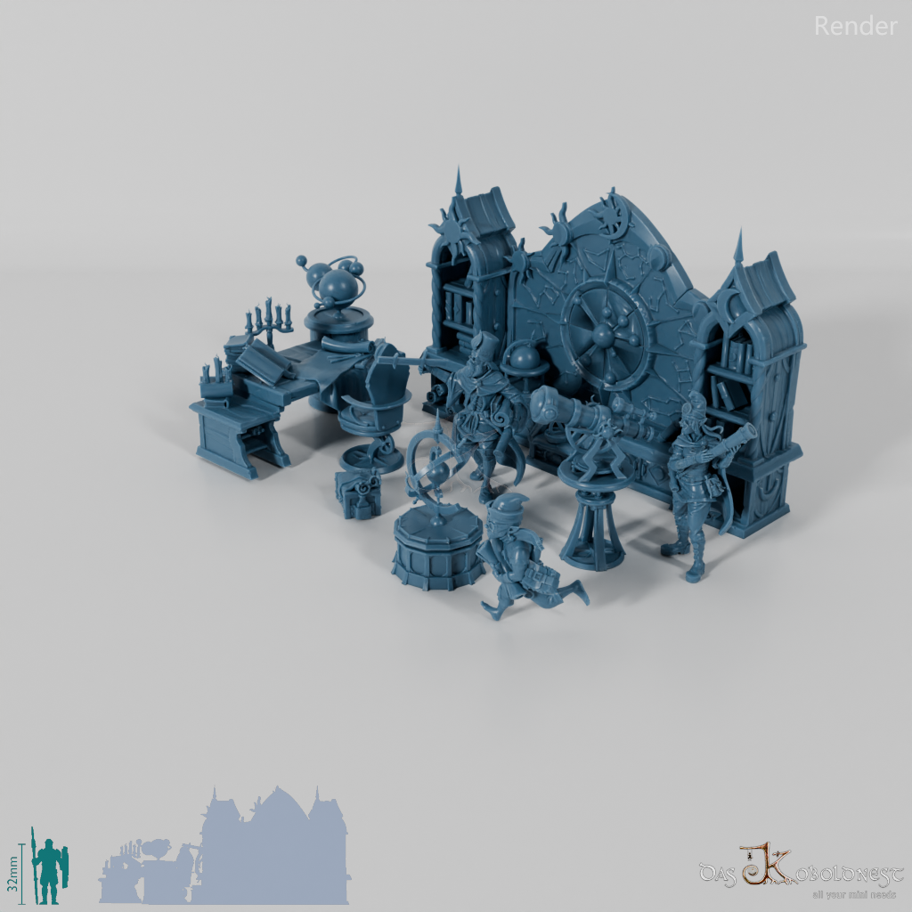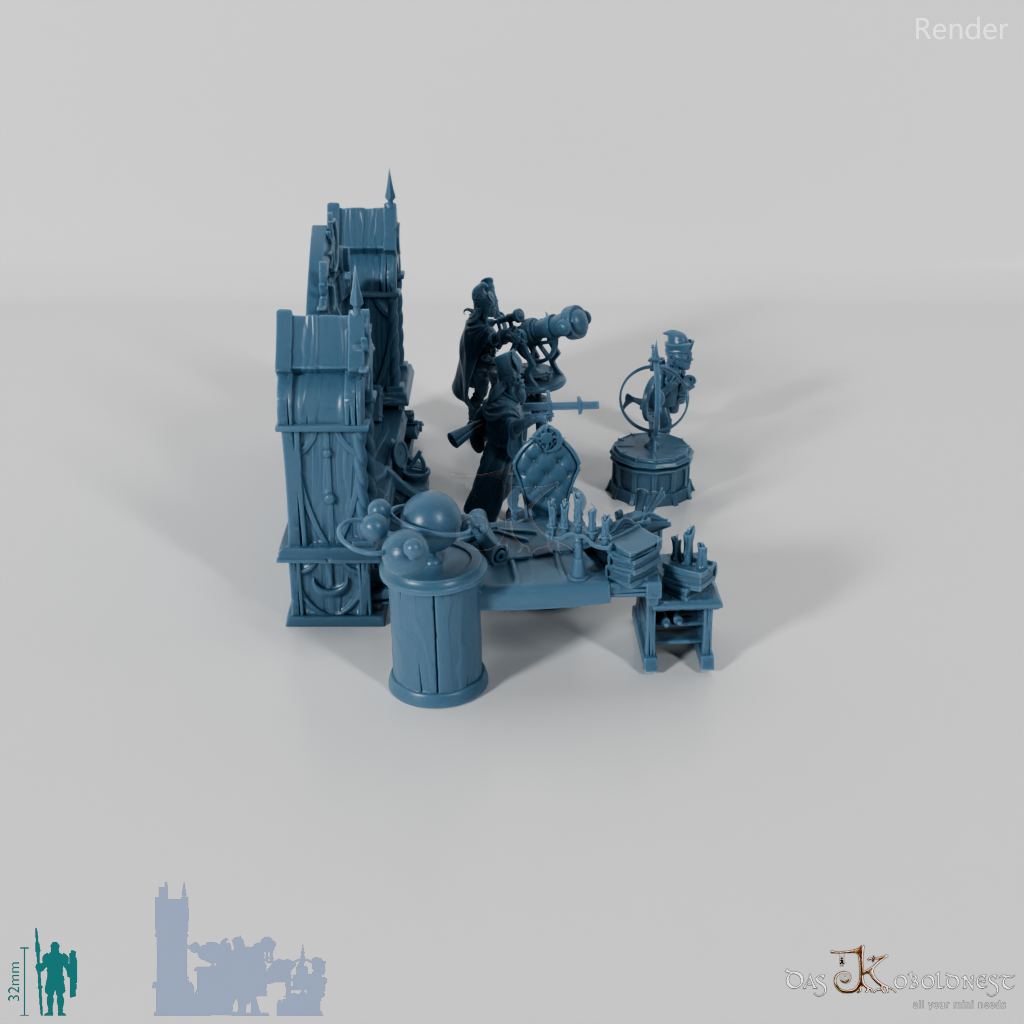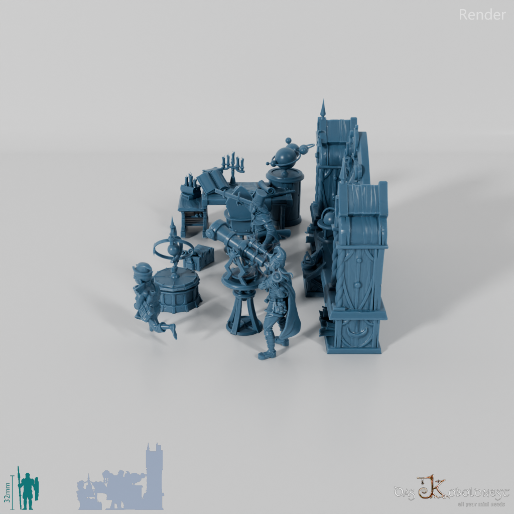 Der gnomische Astronomieassistent, eine Figur voller Charme und Witz, fügt dem Ensemble eine spielerische Note hinzu. Mit seinem Stoffhut und der Brille eilt er umher, einen Stapel Schriftrollen tragend, und verleiht dem Set Dynamik und Lebendigkeit.