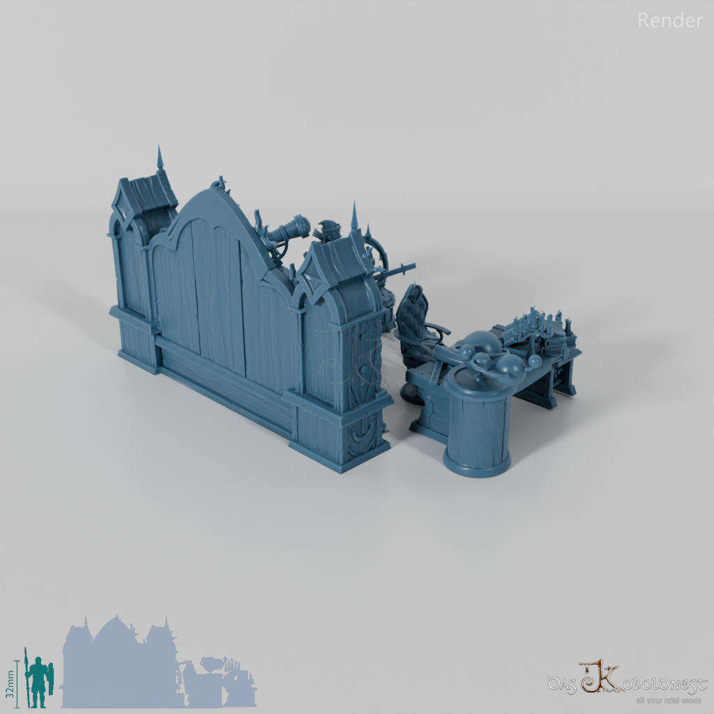 Das Set wird durch eine Astronomiebibliothek komplettiert, die in Form einer mit Sternzeichen, Gestirnen und Planeten verzierten Holzwand gestaltet ist. An deren Seiten stehen verzierte Regale voller Bücher und Schriftrollen, die das umfangreiche Wissen über Astronomie repräsentieren.