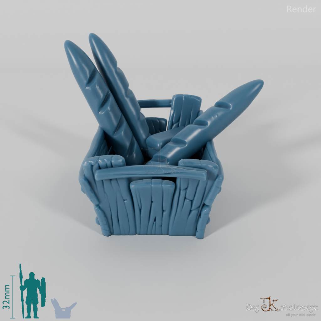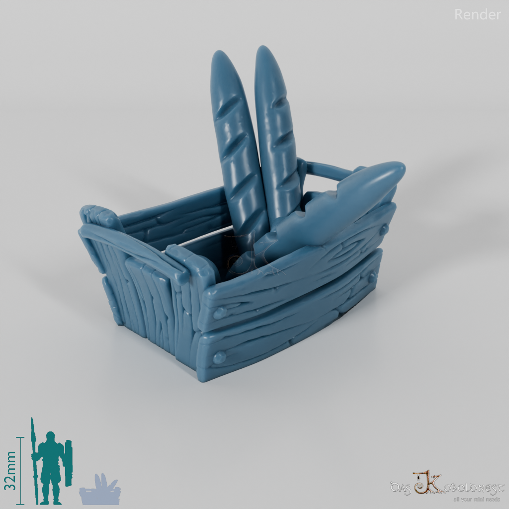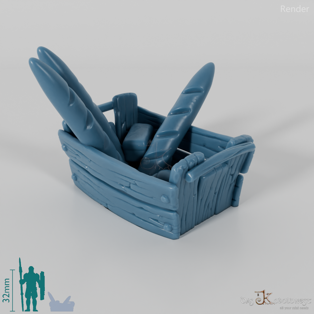 Eine liebevoll gestaltete hölzerne Brotkiste, die mit verschiedenen Broten und Baguettes gefüllt ist. Sie ist ein einfaches, aber wirkungsvolles Detail, um deiner Bäckerei-Szene Authentizität zu verleihen.