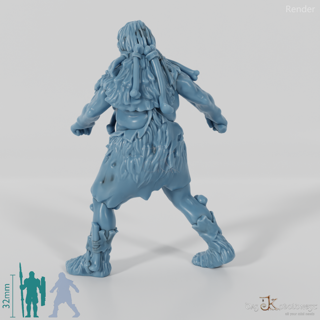 Mit Fellen, sowie Tier- und Menschenschädeln behangener Mann, der den Unterkiefer eines großen Tiers als Keule benutzt