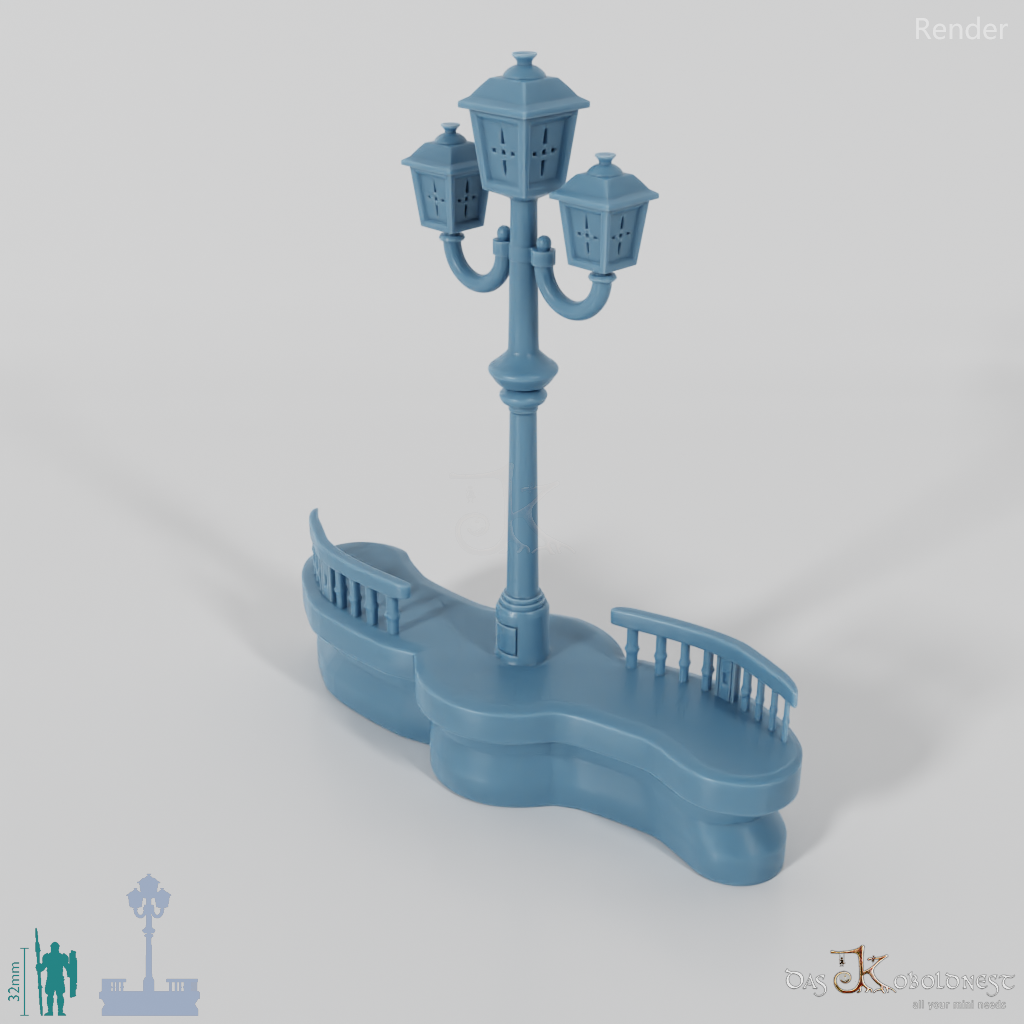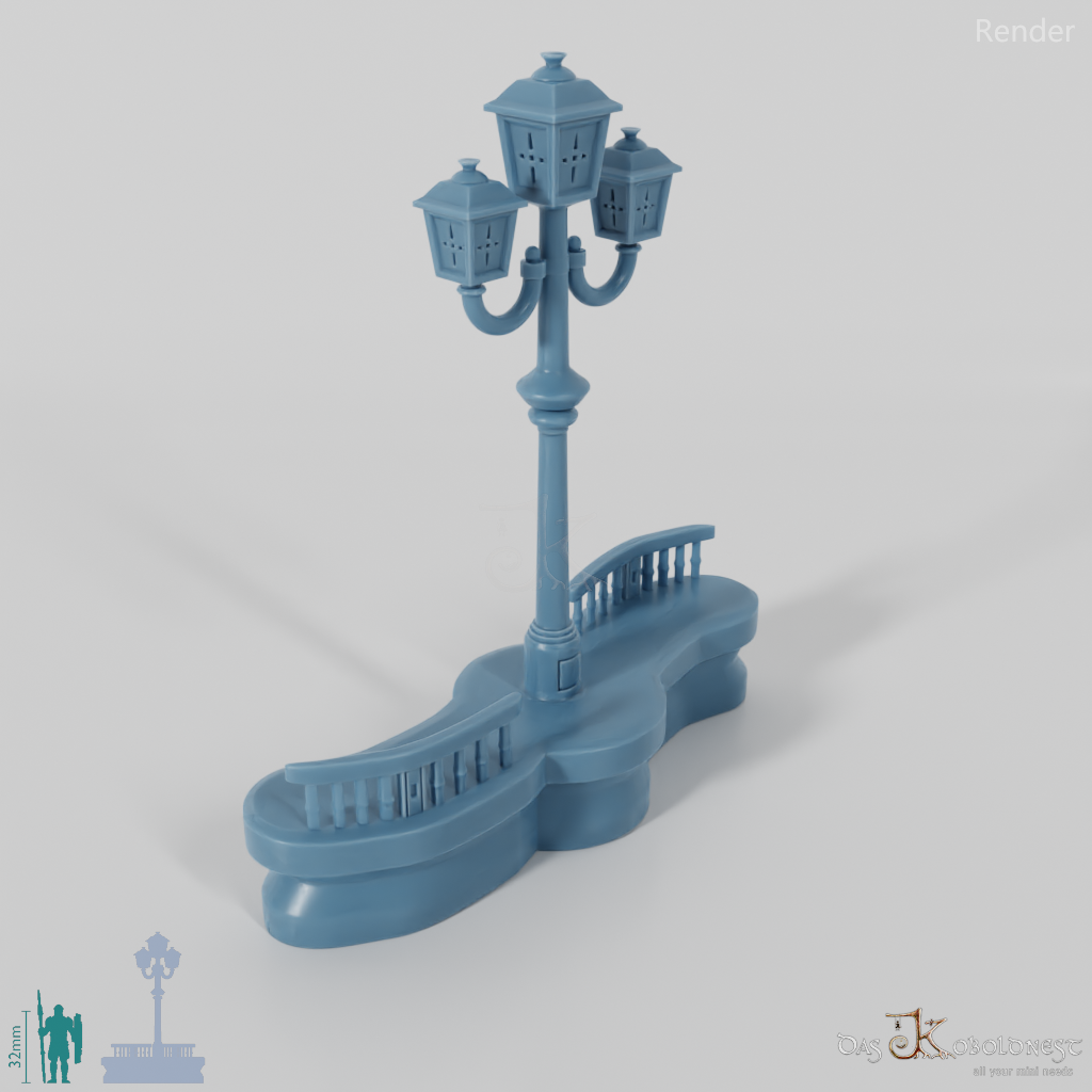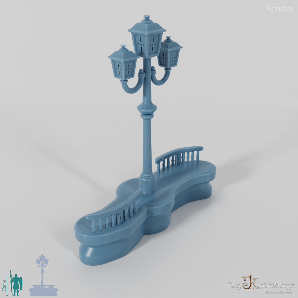 Geschwungene Betonsitzfläche mit zwei gegenüberliegenden Lehnen, in deren Mitte eine elegante Laterne steht