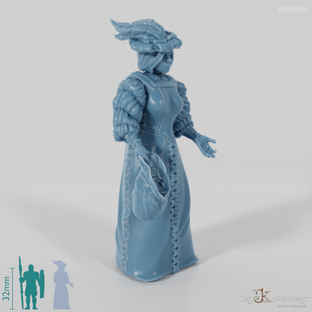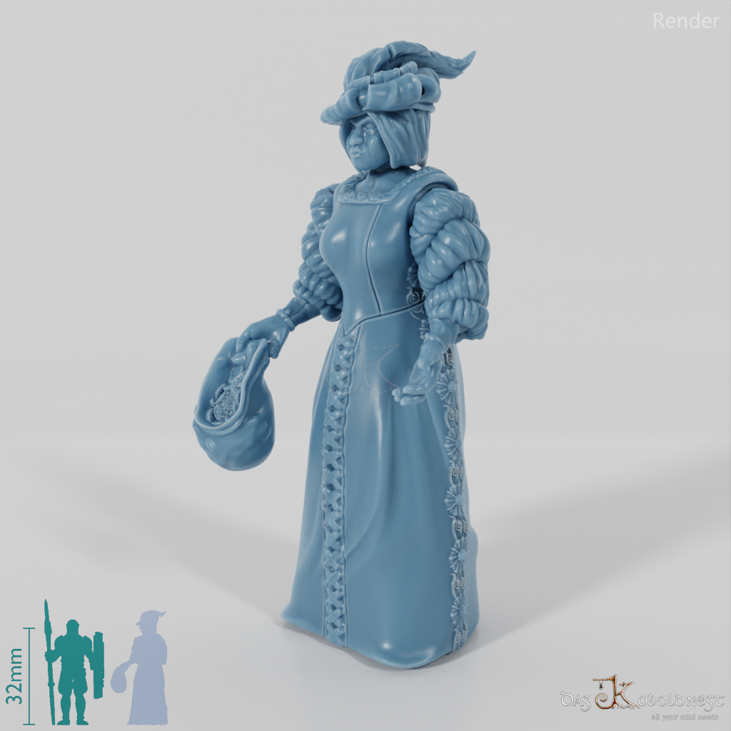 Die Seelen des urbanen Lebens Jede Stadt hat ihre eigenen Heldinnen, nicht nur die Kriegerinnen oder Magierinnen, sondern die alltäglichen Menschen, die das Herzstück jeder Metropole bilden. Dieses Modell einer Adeligen verkörpert das pulsierende Leben und die Vielfalt urbaner Gemeinschaften. Mit akribischer Detailarbeit gestaltet, fängt dieses Modell die Essenz des täglichen Lebens in einer mittelalterlichen Stadt ein, sei es eine Handwerkerin bei der Arbeit, eine Händlerin, die ihre Waren feilbietet, oder eine Bürgerin, die einen Stadtspaziergang genießt. Perfekt, um dein städtisches Szenario in Wargames oder Rollenspielen zu bereichern, dank hochdetaillierte Kleidung, Pose und Accessoires, die den Charakter und Beruf der Stadtbewohnerin hervorheben. Jeder Mensch hat seine eigene Geschichte zu erzählen. Füge dieses Modell zu deiner Sammlung hinzu und belebe die Straßen deiner Stadt mit den Geschichten und dem Alltag ihrer Bewohner:innen. Das Modell wird mit separatem Kopf, Körper und Armen geliefert und ist beliebig mit allen ebenso modularen weiblichen Stadtmenschenmodellen oder Einzelteilen kombinierbar.