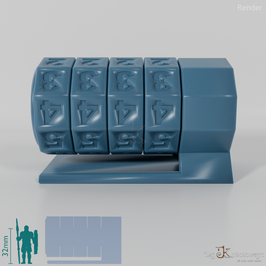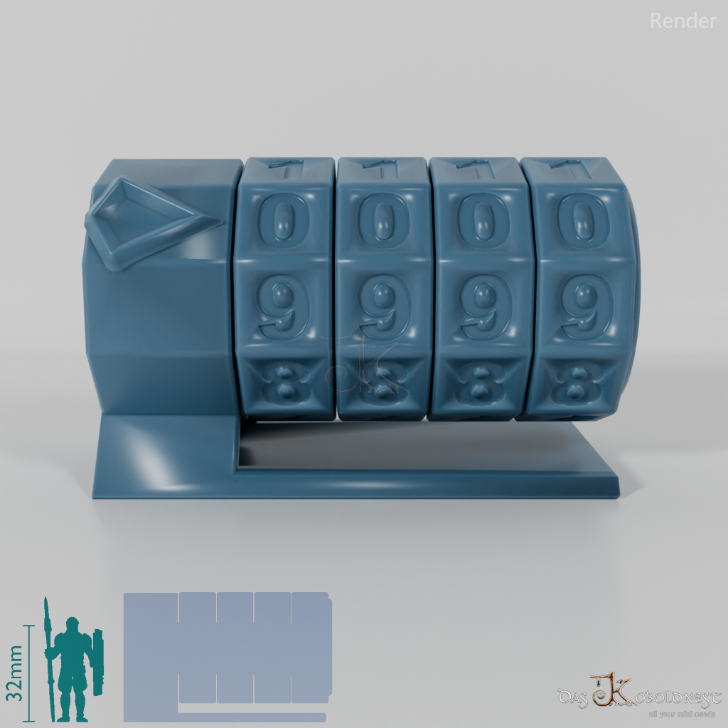 Manuell verstellbarer Zähler mit Standfuß und vier Rädern, die die Ziffern 0-9 zeigen. Der Zähler kann Zahlen von 0000-9999 anzeigen. Rad, Standfuß und Befestigungsscheibe sind separate Teile, sodass der Zähler auseinandergebaut und Teile ausgetauscht werden können. Model by Nissenko licensed under CC BY 4.0